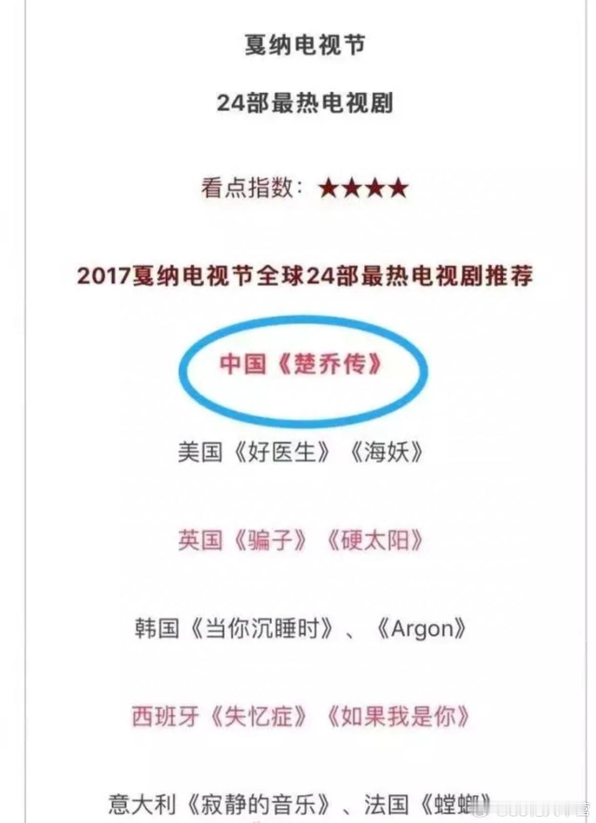 《楚乔传》因此成为中国唯一一部上榜的电视剧!