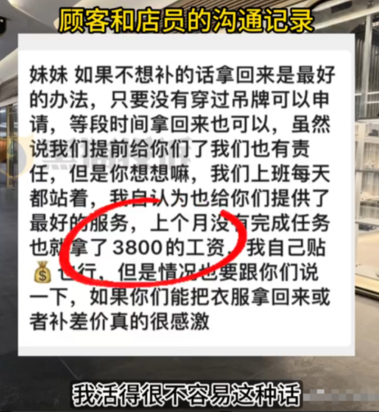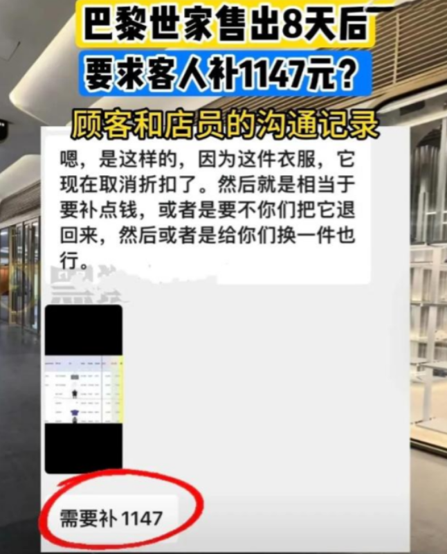 四川成都,一女子和男友在商场购买3件巴黎世家衣服,共计消费10739元,岂料8天后,柜姐突然加上女子微信,表示衣服折扣取消了,需要补1147元差价或者将衣服拿回退钱,甚至柜姐还道德绑架:“一个工资3800,活得很不容易”,女子勃然大怒,回怼柜姐:“我是有钱,又不是有病……” 店大欺客,巴黎世家又双叒上演了! 就很离谱,买定离手后还有“活动取消补差价”这一说法,真以为姐(李静)不会发脾气的吗,姐有钱、但绝对没病! 早在10月底,李静(化名)和男友在巴黎世家消费了10739元,购买了三件衣服,虽然一开始李静也没想着买三件,但架不住柜姐一口一个“乖、亲、宝贝”的称呼,在柜姐的盛情招呼之下,李静很爽快地便支付了。 支付时,李静了解到,巴黎世家竟然还有优惠活动,这可令李静大为惊异,要知道,她和男友一直以来是这家店的忠实消费者,鲜少能碰到优惠折扣的活动。 虽然李静和男友家境殷实,也不差钱,但能省则省,省下来的钱干啥都香。 付完款后,柜姐又请求加李静微信,表示可以在她的朋友圈里看到最新款的衣服,还可以及时的负责售后问题,李静也就同意了。 直到离开后,李静还在和男友表示柜姐的服务态度挺好的,但8天后,李静便断崖式的改变了这种看法。 柜姐表示,李静当时购买的三件衣服中,有一件的折扣在当时已经取消了,她忘了告知李静,现在希望李静能够补交1147元的差价。 李静暗想:真是离了个大谱,作为一名专业的柜姐,活动的到期时间你会不知道?你会忘了说? 当李静提出质疑之后,柜姐又开始道德绑架,表示每天工作很辛苦,月薪只有3800,一站站一天,希望李静能够看在她不容易方份上补上差价。 李静不管她的道德绑架,也不管是否因为业绩没达标的缘故,怒不可遏的她回怼道:“我有钱,但没病。” 就当李静还准备发消息过去时,却发现已经被拉黑了。 …… 早在2018年,被誉为丑出银河系的巴黎世家就上演了店大欺客的一幕。 彼时,因外国人插队与中国一位阿姨发生冲突后,赶来的保安不仅单单拦住了中国人,还放言:中国人滚出去,不要来买鞋! 而商业负责人员也表示:请中国人离开! “辱华”事件曝光后,巴黎世家的形象在国人心中跌到了深渊,并且始终没有给我们一个应有的交代,而今,巴黎世家的一个柜姐竟然再次上演“店大欺客”的一幕,实在是滑天下之大稽。 当李静将事情发布到网络上后,滚滚舆论滔天而来,其中有两条是这么说的: “巴黎世家工资3800,胖东来保洁都7/8000呢!” “丑出银河系的衣物,我就是有钱也不会买的!”