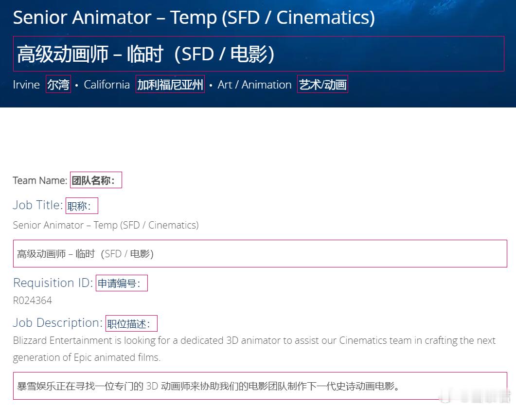 · SFD部门招募高级动画师临时工,微软在砍掉很多SFD的人手之后,相关的需求似乎倾向于使用临时工来帮忙。暴雪已经发布了多个SFD部门临时职位空缺,合同期为半年左右,开始日期为2025年3月,由此推算,明年微软Xbox大秀时可能有片看。