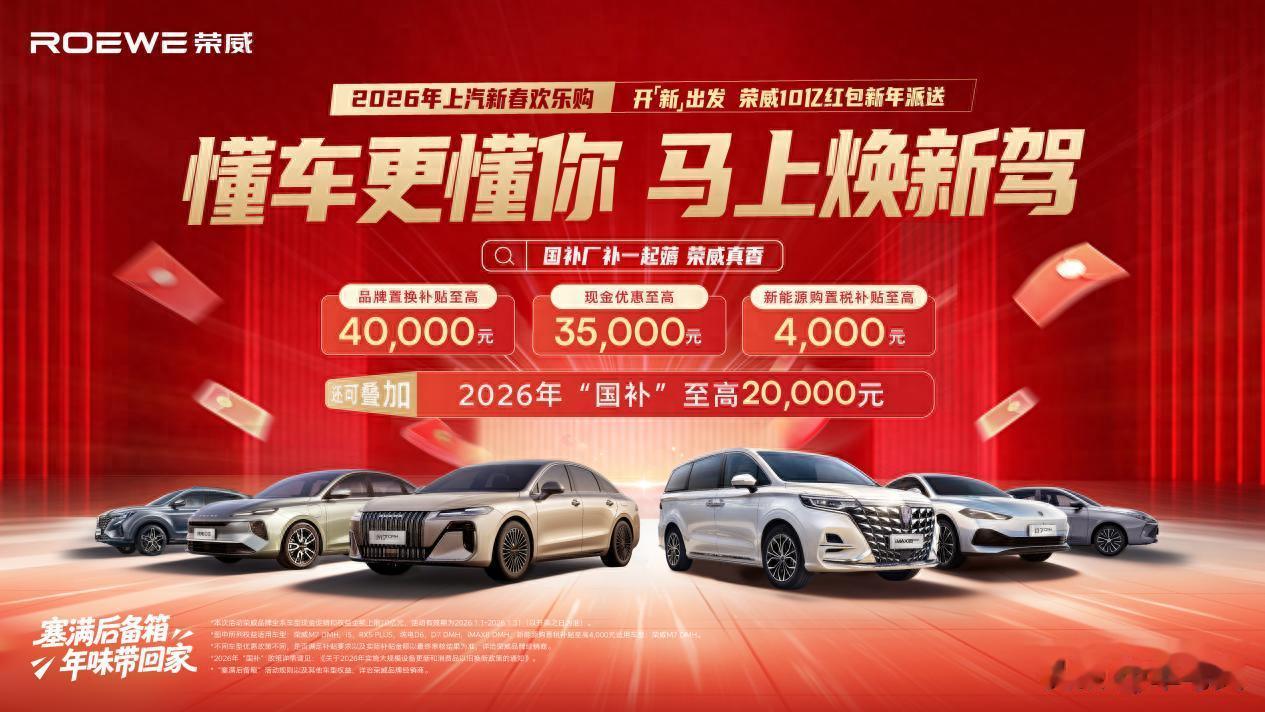新年开新车,福利正当时!国补叠加厂补,入手即赚。想要用实惠价格拿下高品质荣威座驾,不妨即刻前往当地荣威 4S 店咨询试驾,国补额度有限,欲购从速!