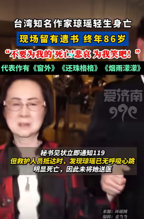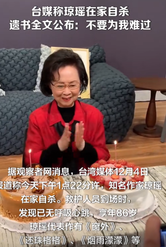 (来源:央视新闻、观察者网2024年12月4日关于《据台湾媒体12月4日消息,今天下午1点 22分许,知名作家琼瑶在家自杀。》的报道)