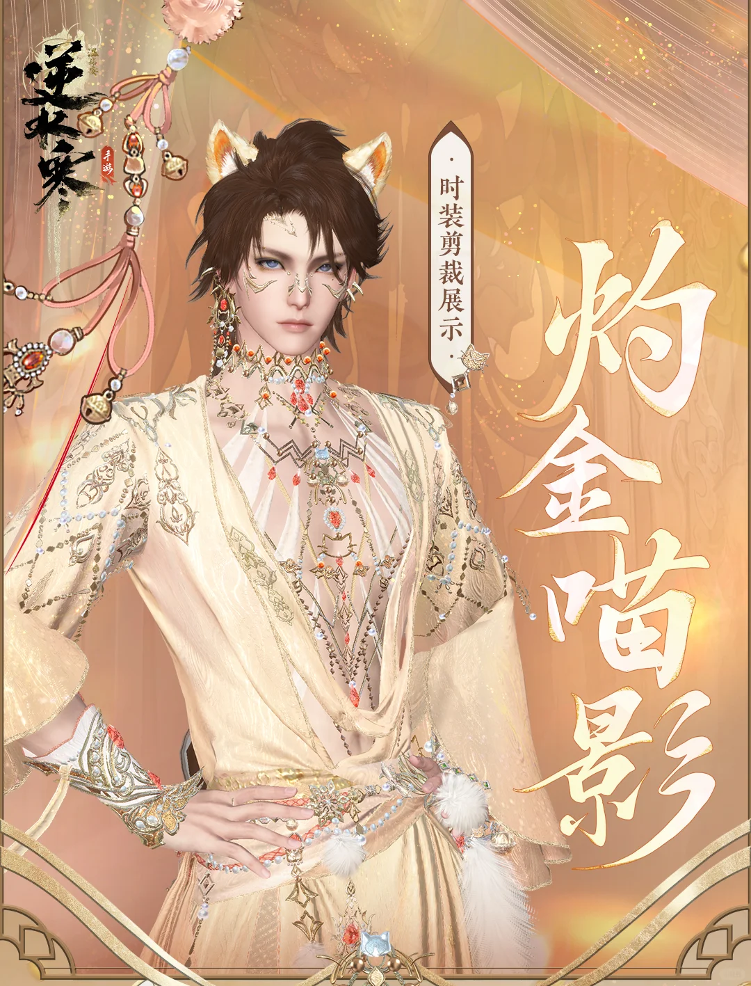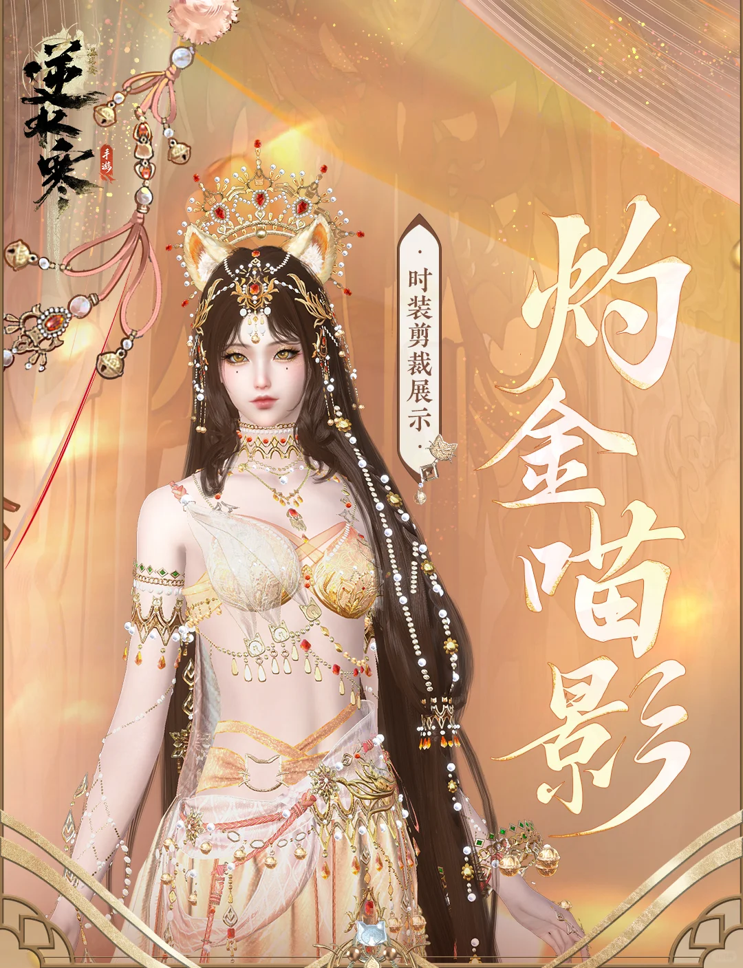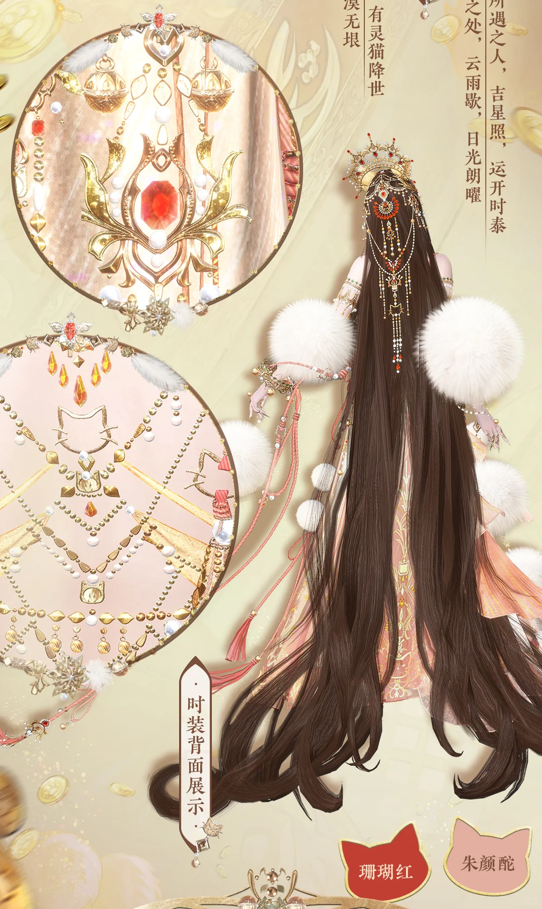 👗 万物有灵·猫主题系列【灼金喵影】(礼盒) ⏰ 2024年12月5日——2025年1月17日0点 💰 288r 🉑代金券 🎁 买一送九 同步解锁专属黑发头像、配饰【软云香绒】、配饰【金池重焰】、配饰【喵逸流砂】\【赤玉衔晖】、时装专属妆容、单人动作特效、双人动作特效、休闲动作与群龙之首结算动画。 ✂️ 支持发型裁剪 2.2.3版本(12月27日)更新后,同步开放发型裁剪,会比默认款稍微短一些,更适配小个子 💎 专属稀有发型【长乐】 同步上架鉴石兑换商店