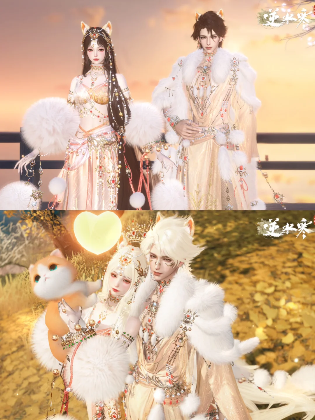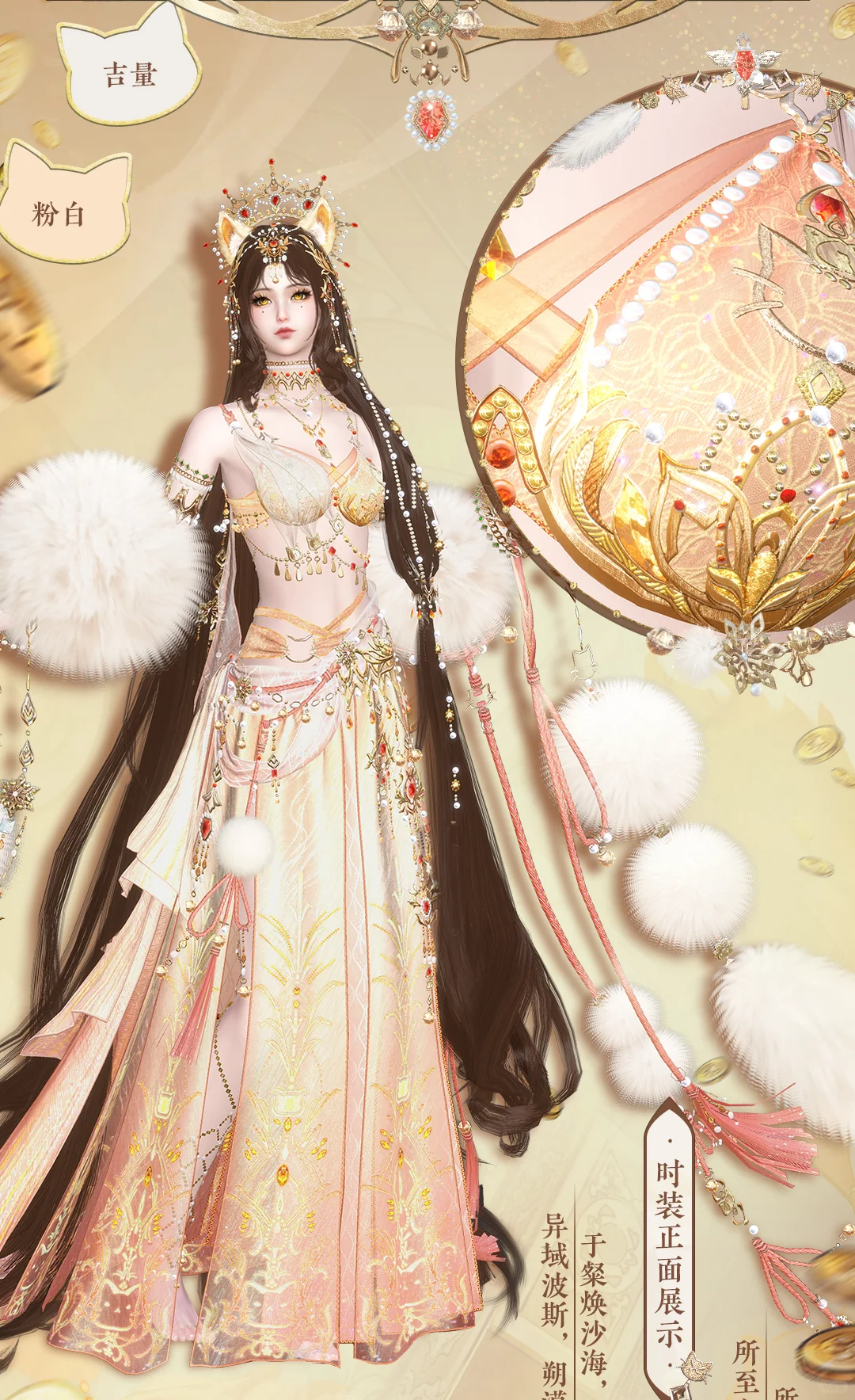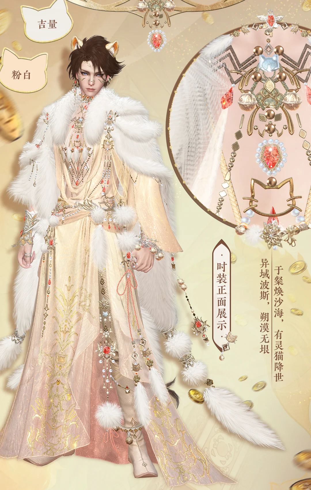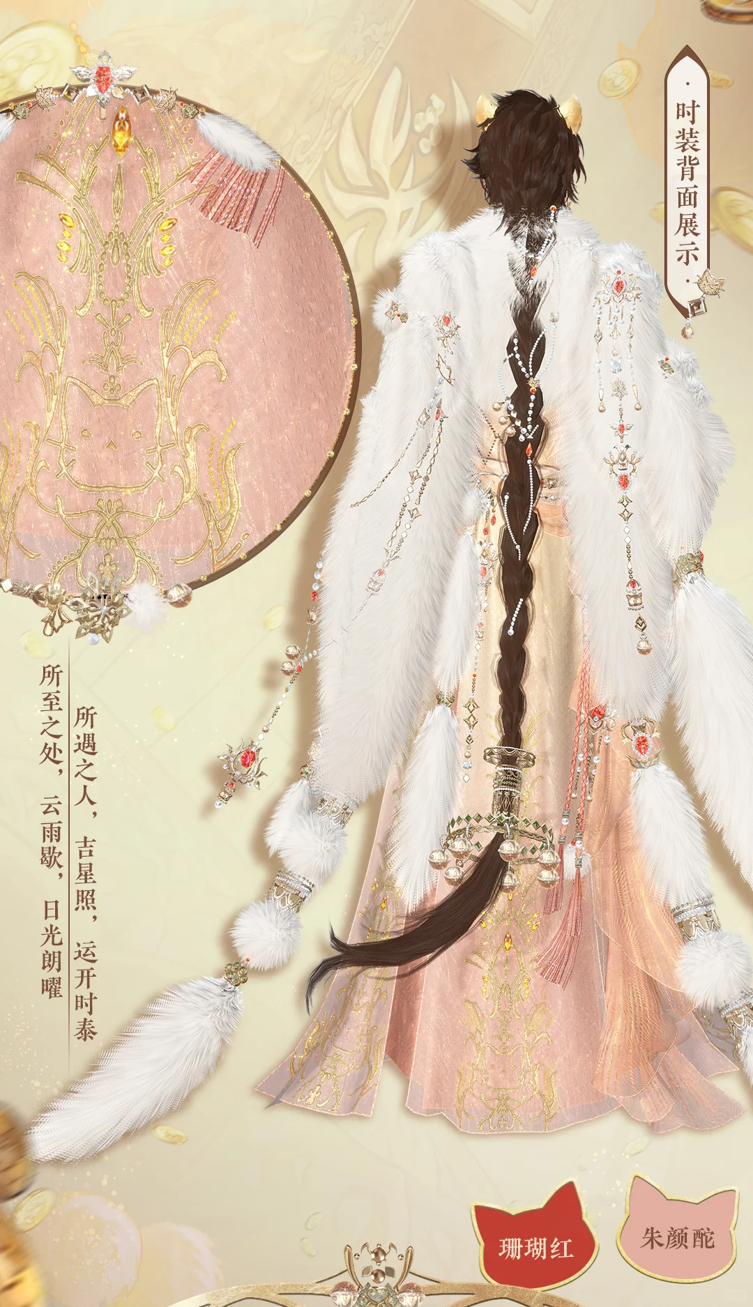 👗 万物有灵·猫主题系列【灼金喵影】(礼盒) ⏰ 2024年12月5日——2025年1月17日0点 💰 288r 🉑代金券 🎁 买一送九 同步解锁专属黑发头像、配饰【软云香绒】、配饰【金池重焰】、配饰【喵逸流砂】\【赤玉衔晖】、时装专属妆容、单人动作特效、双人动作特效、休闲动作与群龙之首结算动画。 ✂️ 支持发型裁剪 2.2.3版本(12月27日)更新后,同步开放发型裁剪,会比默认款稍微短一些,更适配小个子 💎 专属稀有发型【长乐】 同步上架鉴石兑换商店