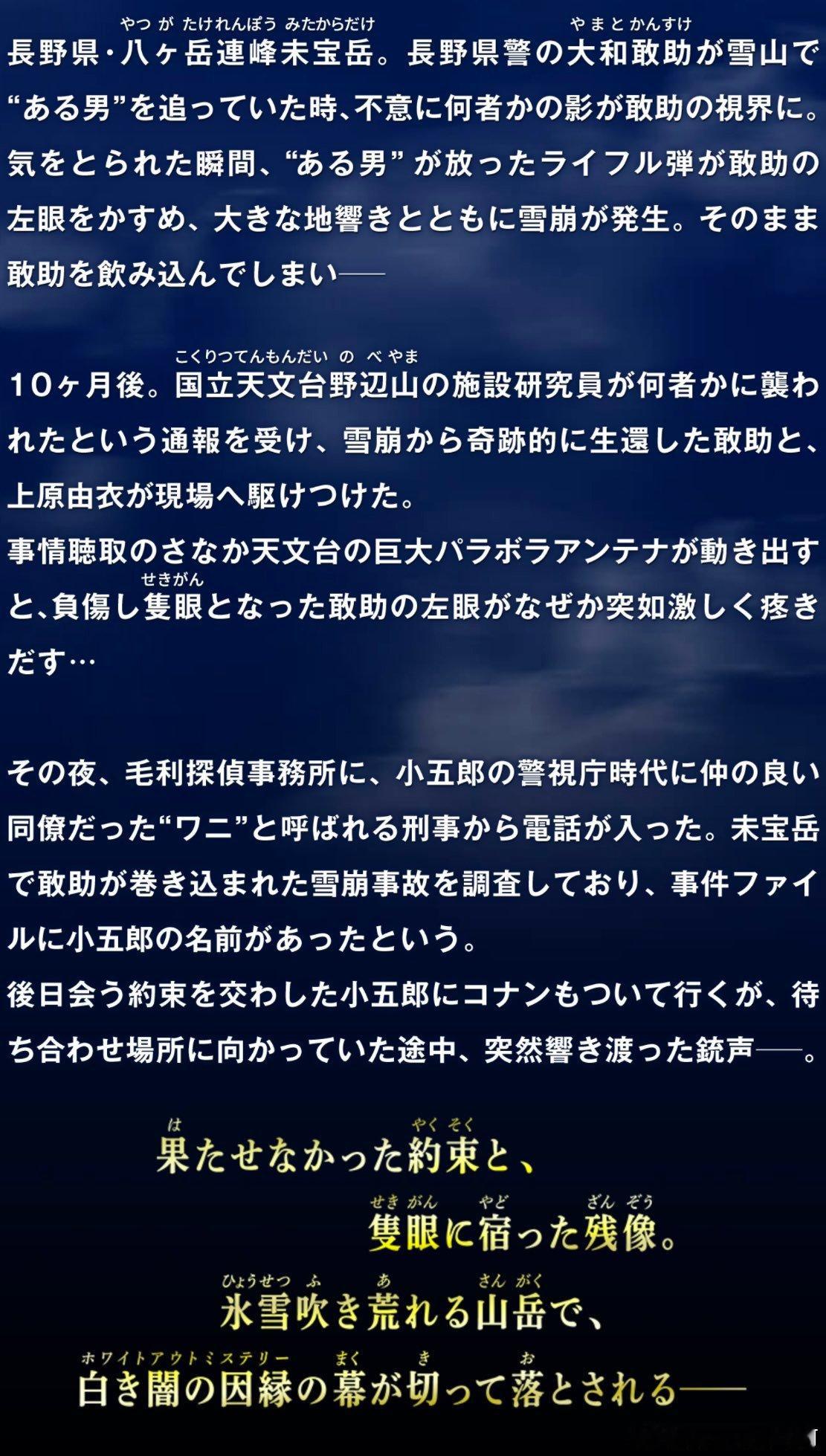 接到国立天文台野边山设施的一名研究员被袭击的通报后,奇迹般从雪崩中生还的敢助和上原由衣赶往现场。就在进行情况询问的过程中,天文台巨大的抛物面天线开始转动,负伤而变成独眼的敢助的左眼突然剧烈疼痛起来……