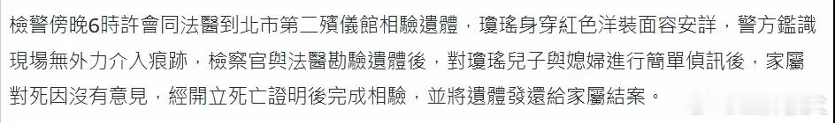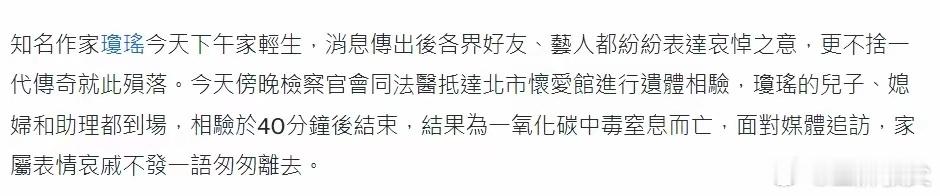琼瑶系一氧化碳中毒窒息而亡 毫不意外,这样才符合琼瑶的性格,这样她能美美的去和爱