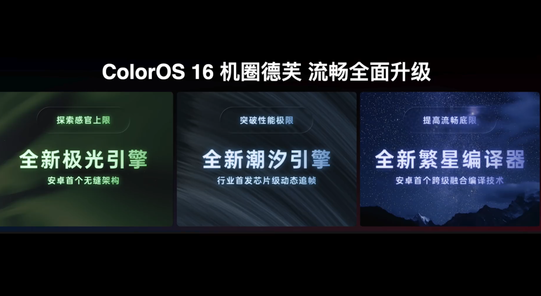 想要最大化地发挥出性能潜力,离不开系统的深度调校。OPPO Find X9系列将首发ColorOS 16系统,要知道在ColorOS 15上,OPPO成为了“机圈德芙”的代名词,而全新的ColorOS 16继续进化做到了全面流畅,这背后有三大核心技术:全新极光引擎、全新潮汐引擎和繁星编译器,从不同维度攻克安卓系统的流畅性难题。