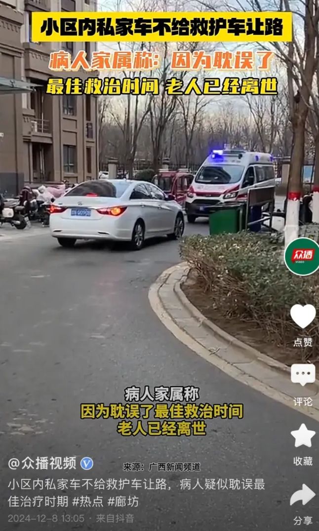 太可气了,河北廊坊一私家车阻挡120急救车,导致病人耽误了最佳治疗时间。 广西新闻报道,2024年12月7日上午,120急救车在河北廊坊某小区接病人,当120车行驶到小区一狭窄路段,迎面开过来一辆白色的私家车挡住了去路,两辆车僵持了一会儿,病人家属解释道:是自家老人,避让一下。但是,私家车毫无避让的意思,径直往前开,逼得120急救车往后倒退。 于是,有很多网友怒斥道:这私家车到底有多么重要的事儿?连120急救车都不避让,他哪来的底气?希望相关部门查查这小车司机是什么级别的人物?有什么原因让他这么豪横? 1 2月7日下午一点多,病人家属发文称:疑似耽误了最佳治疗时期,病人已经死亡。 有知名律师称:司机行为人如不主动避让救护车属于违反交通法规的行为,如造成严重后果的,处于机动车驾驶证扣分,罚款或拘留五到10天的处分。如造成人员伤亡的,需要依法承担相应法律责任。 信息来源,广西新闻。
