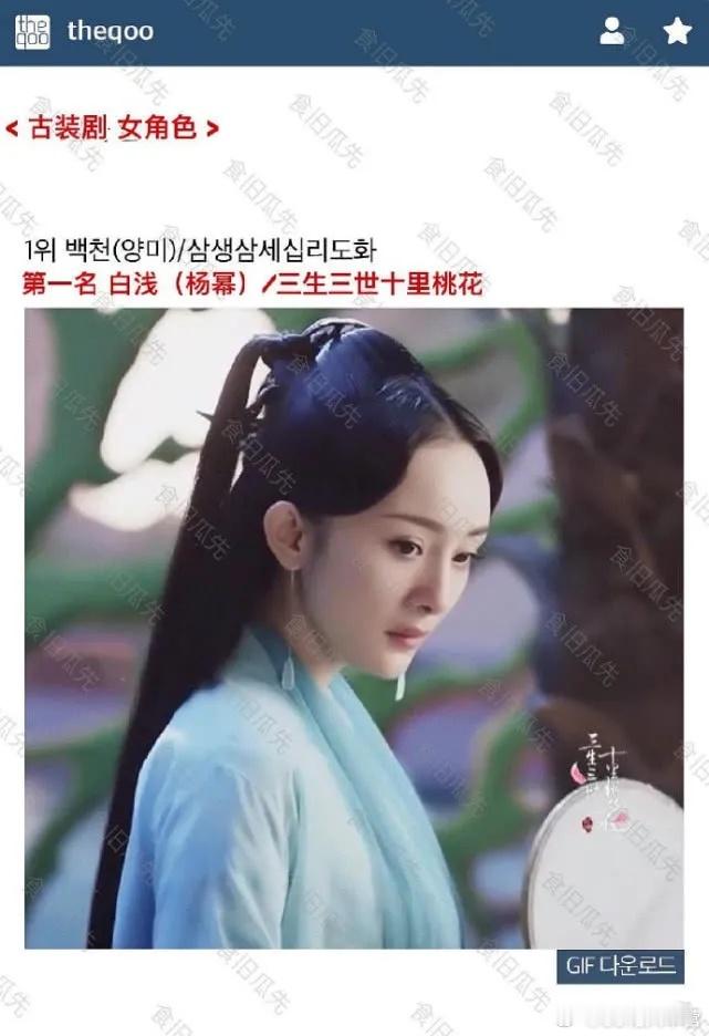 当年韩国论坛theqoo中国房剧迷票选出来的最爱的中国电视剧角色,古装剧女角色第一名就是《三生三世十里桃花》杨幂饰演的白浅!