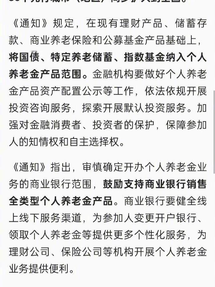 《关于全面实施个人养老金制度的通知》明确,个人养老金制度将于12月15日推广至全国。