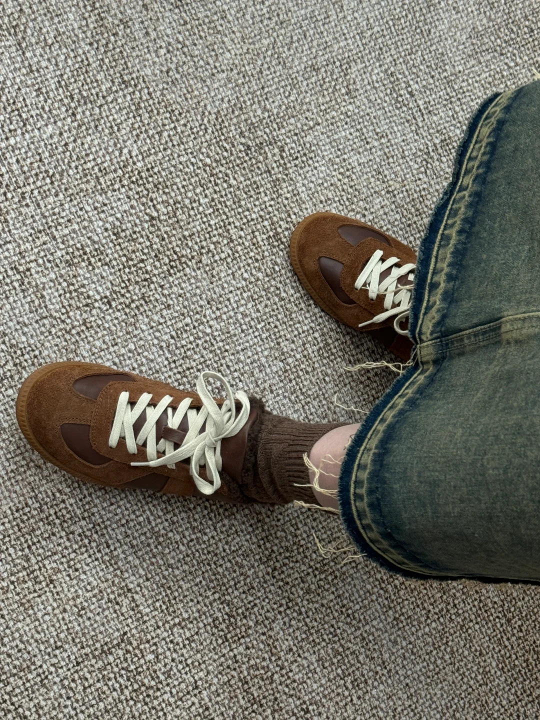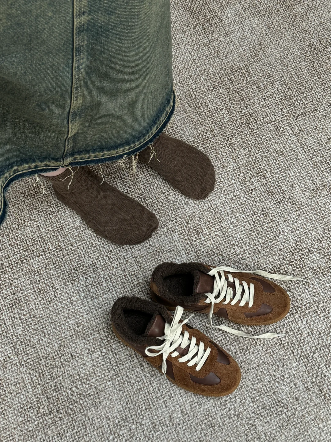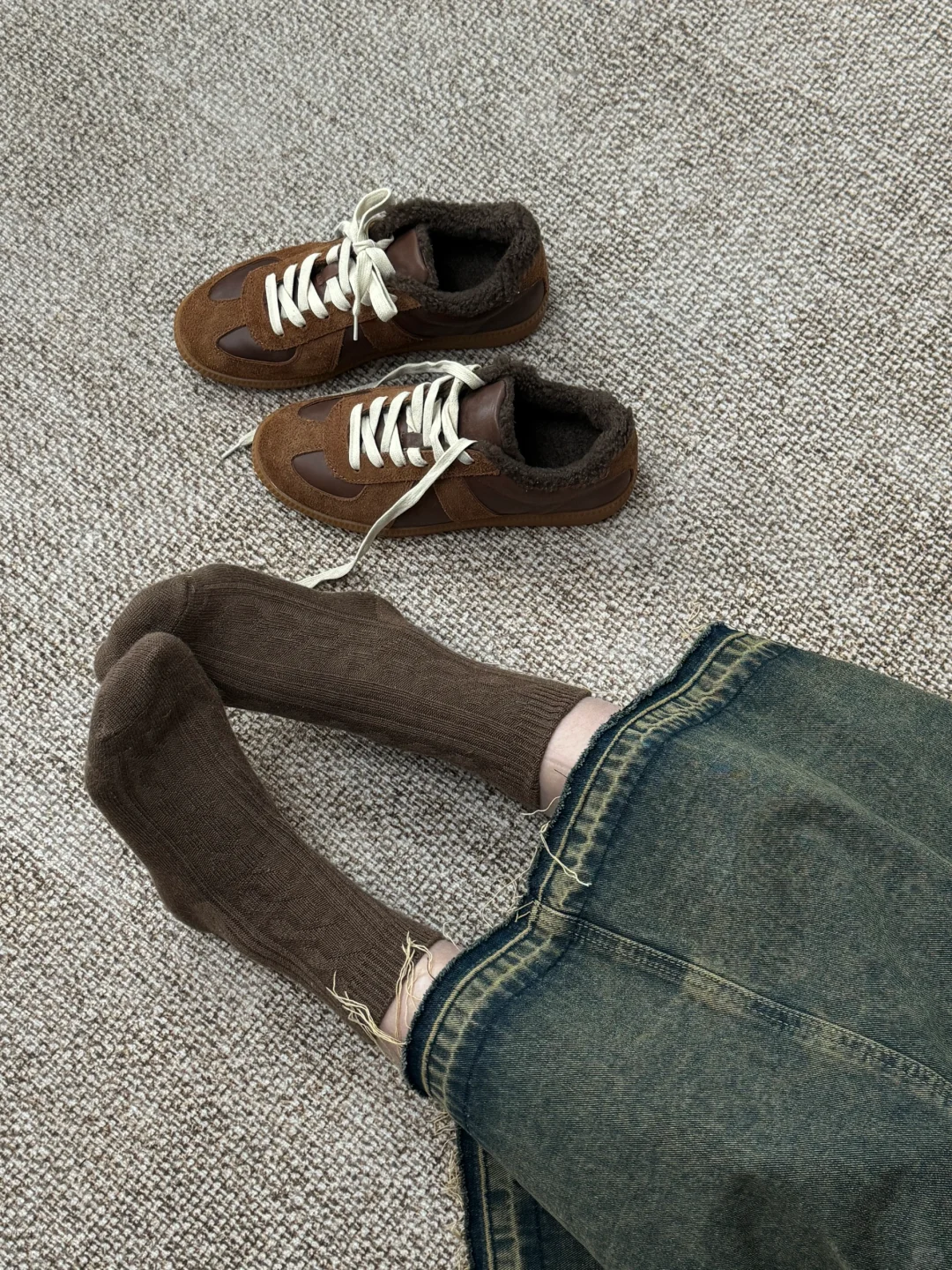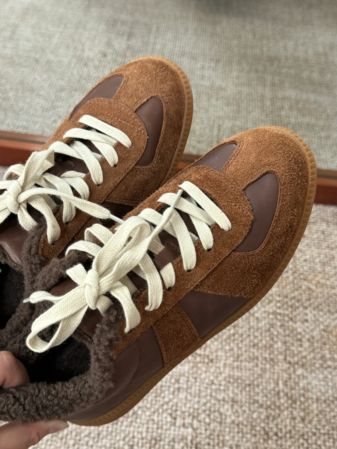 - 德训脑袋一年四季都爱穿德训鞋! 到了冬天就要加点毛茸茸☃️ 保暖舒适又充满暖冬氛围 喜欢这双的复古美拉德配色 皮面和绒面的拼接设计 层次感更强 搭配一条流苏牛仔裙 松弛感满满🍂