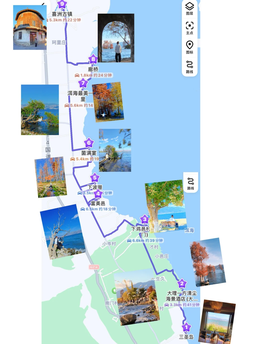 三圣岛👉龙龛码头(喂海鸥)👉大理一方清尘酒店(拍红水杉林)👉下鸡邑村👉富美邑👉下泼淜👉洱海最美一公里👉廊桥👉喜洲古镇