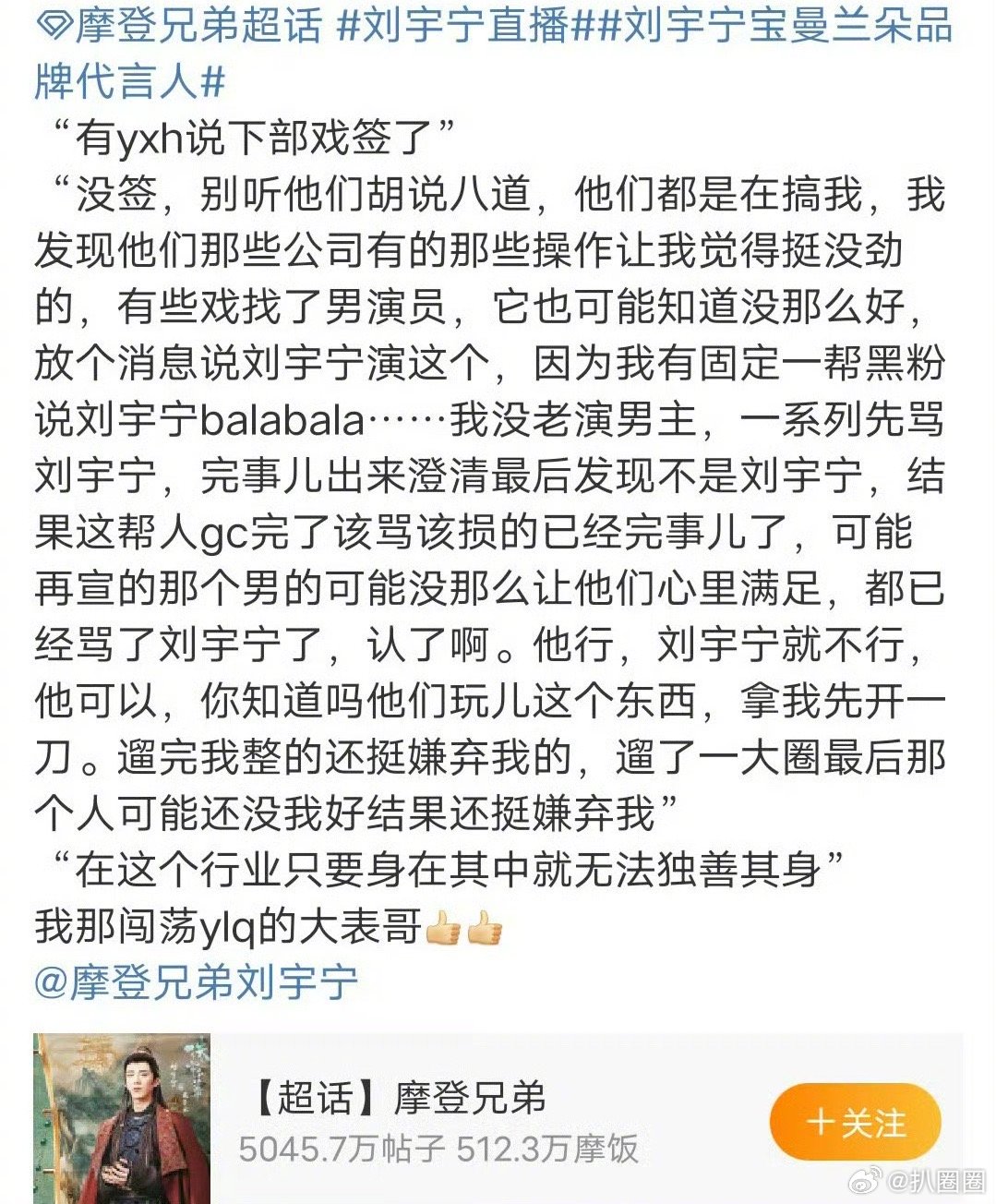 刘宇宁直播说有人搞他,有的剧男主早定了,没那么满意就把他溜一圈把他一通骂~[吃瓜