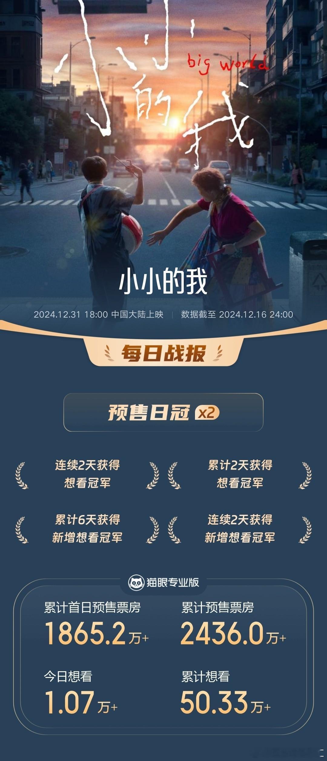 电影小小的我预售破2000万 易烊千玺主演电影《小小的我》想看人数突破50万,票房预售突破2000万,连续多天荣获想看榜,真的可以期待了!
