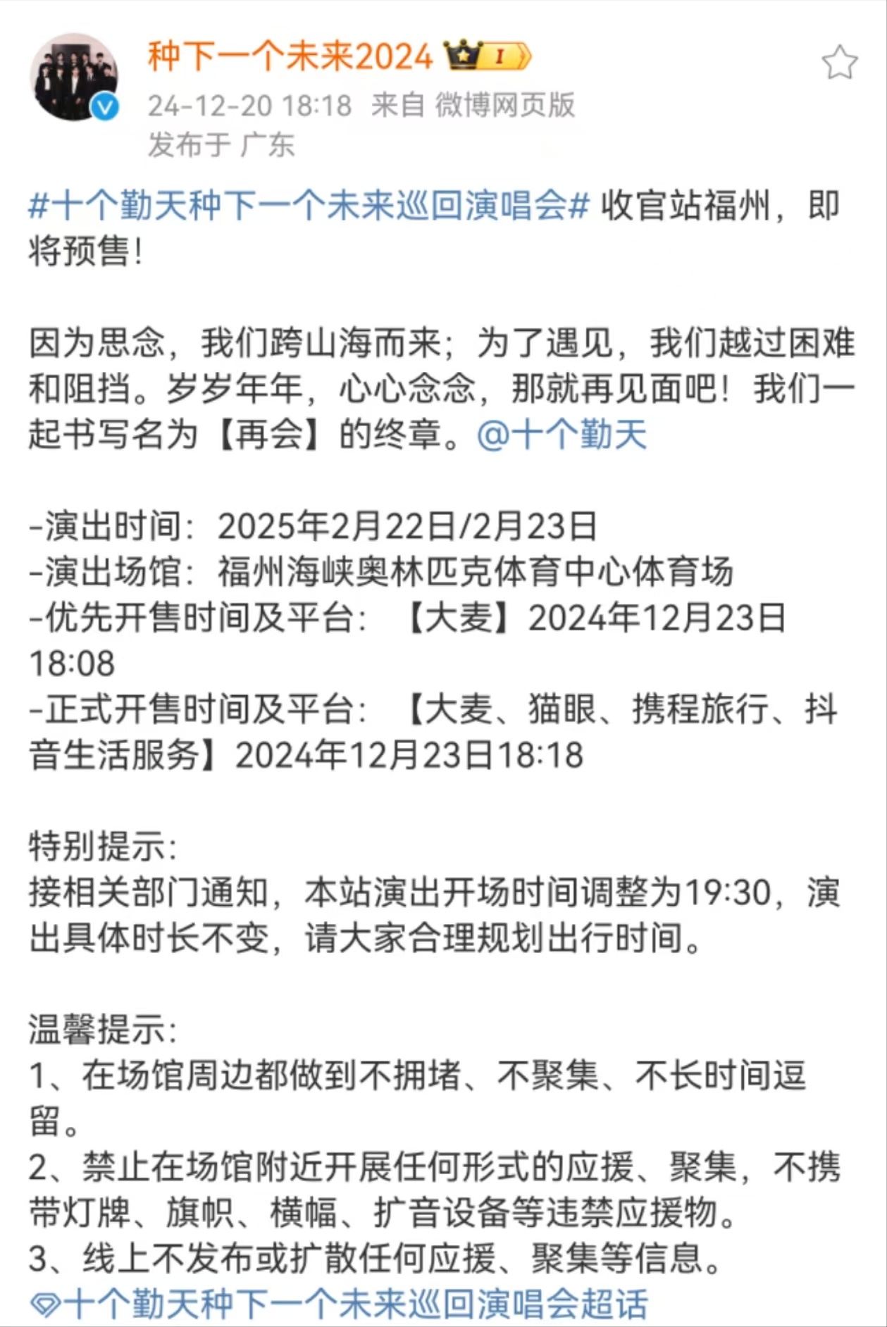 十个勤天种—下一个未来巡回演唱会收官站马上要开始预售啦!地点在福州,时间是25年的2.22/2.23!!