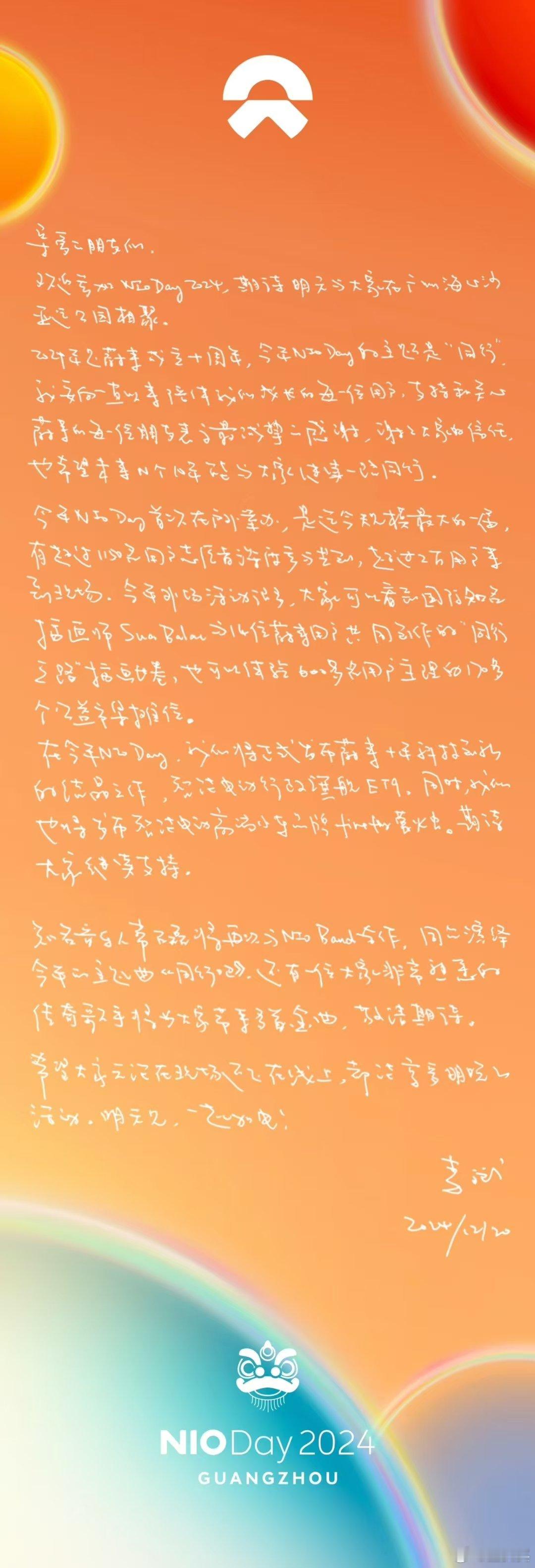 NIO Day 2024 今晚19:00 广州•海心沙一封信,2017年写到20