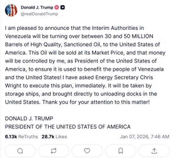 当地时间1月6日,美国总统特朗普通过其自创的社交媒体平台“真实社交”对外发布一则重磅声明。声明称委内瑞拉将向美国移交3000万至5000万桶“受制裁的高品质石油”。这批石油会按照当前市场价格进行出售。交易所得的全部资金将由特朗普亲自负责监管。特朗普表示这笔资金的最终用途是为了造福委内瑞拉人民和美国人民。声明一经发布,特朗普便立刻下令能源部长克里斯·赖特启动该计划的执行工作。相关石油将通过专用储油船进行接收。之后直接运往美国指定的卸货码头。以当前美国基准原油西德克萨斯中质油的价格测算,这批石油的价值或超28亿美元。该数值等同于委内瑞拉30至50天的原油总产量。石油出口在委内瑞拉经济中的占比超过90%。如此规模的石油移交会给该国经济带来直接冲击。美国与委内瑞拉之间的能源博弈并非一朝一夕。这一博弈的历史最早能追溯到20世纪20年代。当时美国“石油七姐妹”通过各种方式渗透进委内瑞拉石油产业。美国“石油七姐妹”凭借垄断性协议牢牢控制了该国大部分石油资源的勘探开发与销售环节。马拉开波湖等优质油田产生的巨额利润,持续不断地输送至美国本土。1970年代,委内瑞拉正式推动石油产业国有化进程。委内瑞拉成立了国家石油公司(PDVSA)。这一举措彻底结束了西方资本对本国石油产业的长期控制。2017年起,美国开始对委内瑞拉实施持续不断的制裁。这些制裁措施直接导致委内瑞拉原油产量从巅峰时期的日均350万桶,大幅下降至2025年的不足100万桶。原油出口量也降至日均50万桶左右。目前已有1700万桶原油因封锁滞留海上。始终无法离港运输。特朗普毫不掩饰其对委内瑞拉石油资源的企图。在美军抓捕马杜罗后,特朗普随即表示,将让美国大型石油公司前往委内瑞拉投资,重建石油基础设施并为美国“创造收益”。