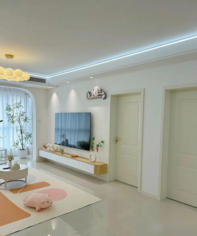 屋主没做复杂吊顶,只走了一圈双眼皮边吊,既省了钱又不压层高;电视墙舍弃了昂贵的岩板或护墙板,直接刷大白墙,搭配小山丘射灯——灯光打在墙上像洒了层月光,比背景墙更有氛围感。