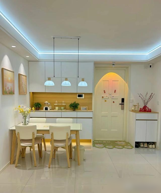 5万软装里,钱都花在了“能提升幸福感”的地方:阳台的白色纱帘+圆形小桌+躺椅,3000块不到,却成了屋主最爱的“下午茶角”;餐边柜选了肤感白柜门,中部镂空贴原木色饰板,内嵌灯带——晚上开一盏,倒杯红酒看剧,仪式感拉满;茶几选了小体积、造型独特的款式,不占空间还能当“移动小桌板”。更妙的是色彩搭配:大面积白+局部橙黄,再点缀几盆绿植,整个家像块“会呼吸的马卡龙”,看着就心情好。
