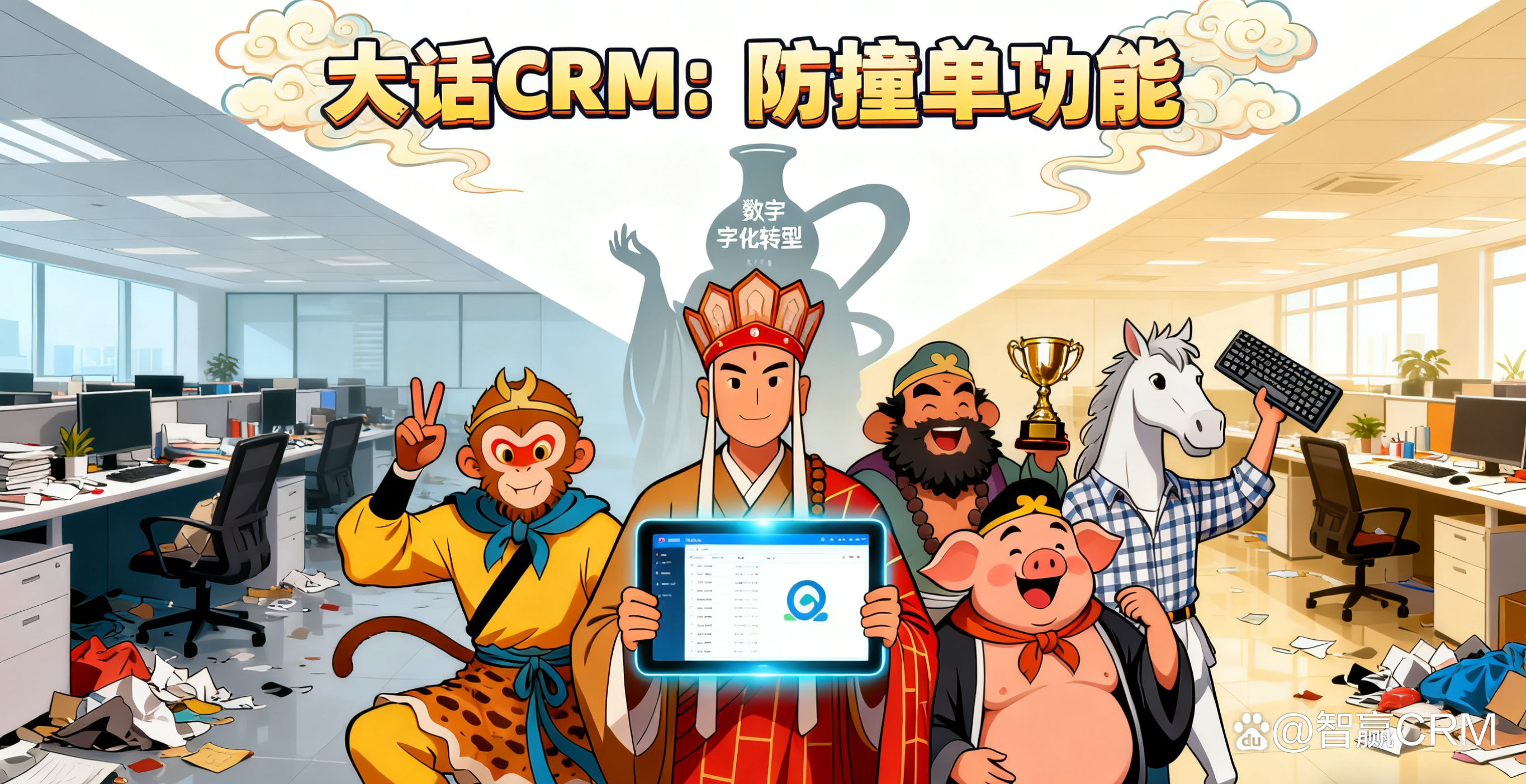 唐僧手持平板电脑赶来,皱眉劝解,“悟空八戒,莫要争吵!为师刚引进了CRM 系统。”