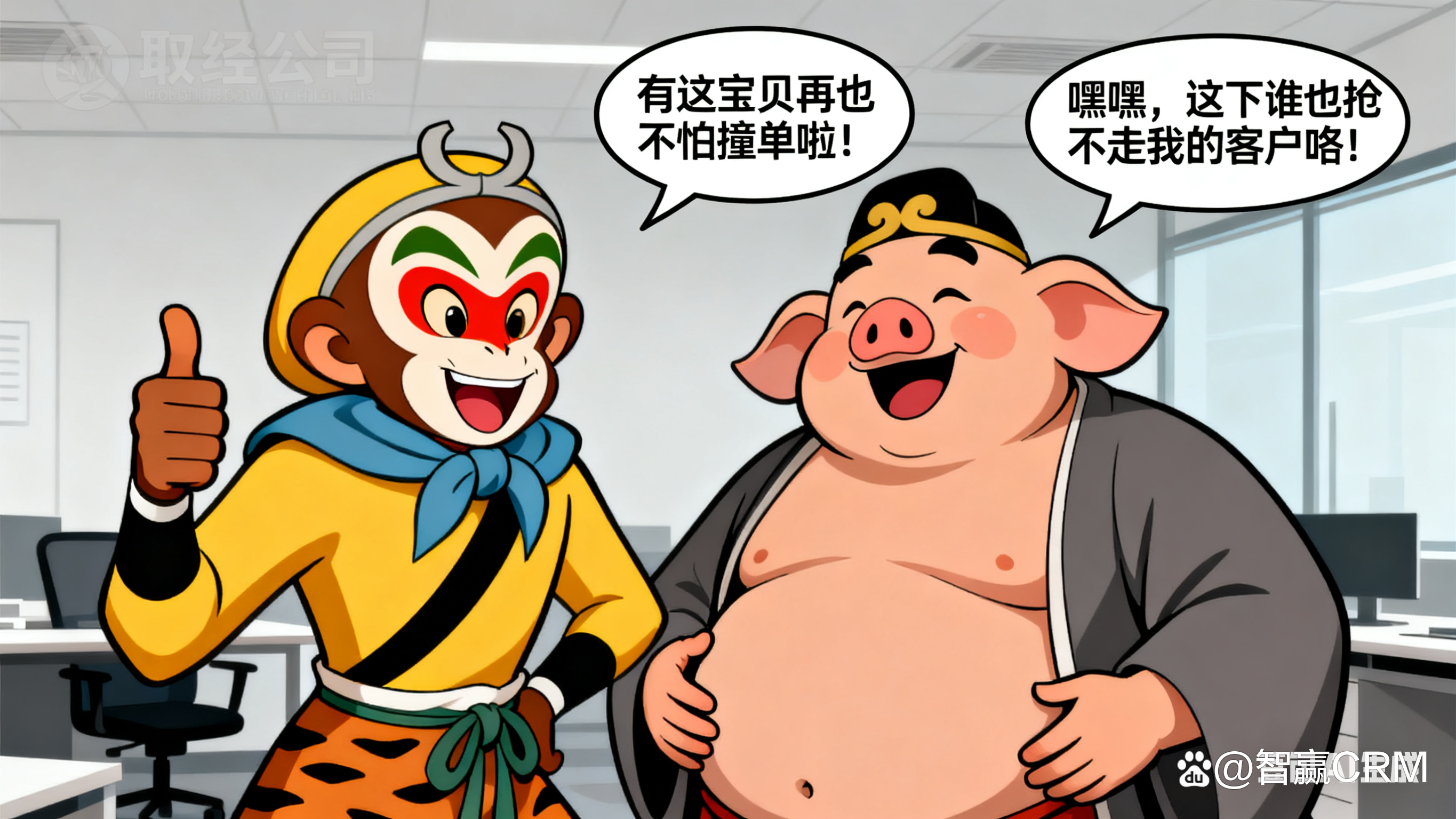 取经公司办公室内,孙悟空叉腰瞪眼,指着猪八戒大喊,“呆子!这单明明是我先联系的!”;猪八戒抱臂鼓腮,“猴哥你胡说!客户明明先加的我微信!”。