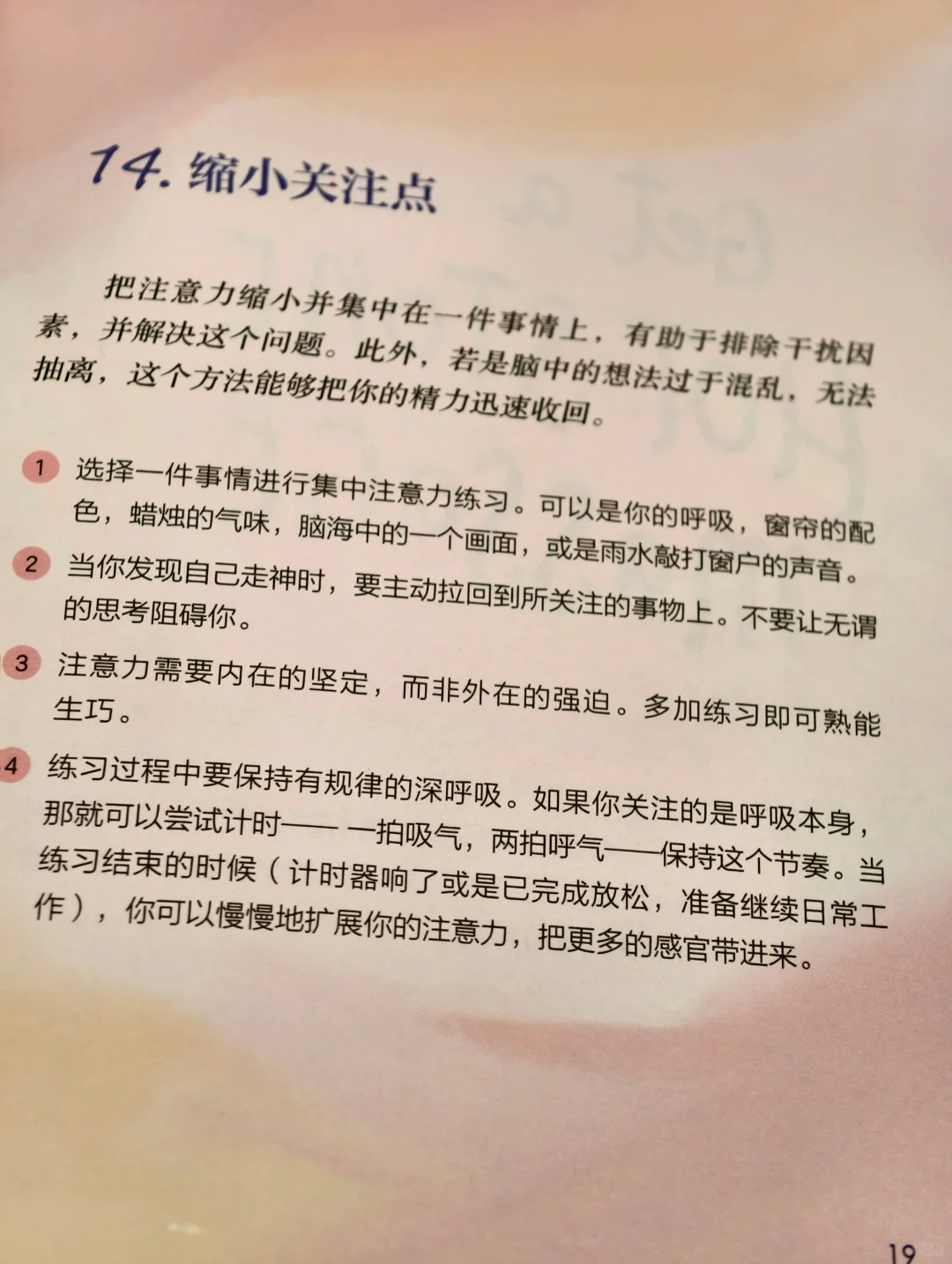选择一件事情进行集中注意力练习,可以是你的呼吸、窗帘的配色、蜡烛的气味等;