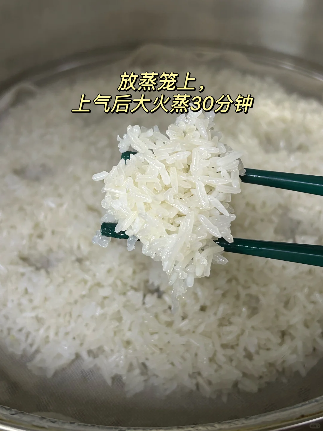 2. 把浸泡好的糯米沥干水分,放入蒸笼中蒸熟。