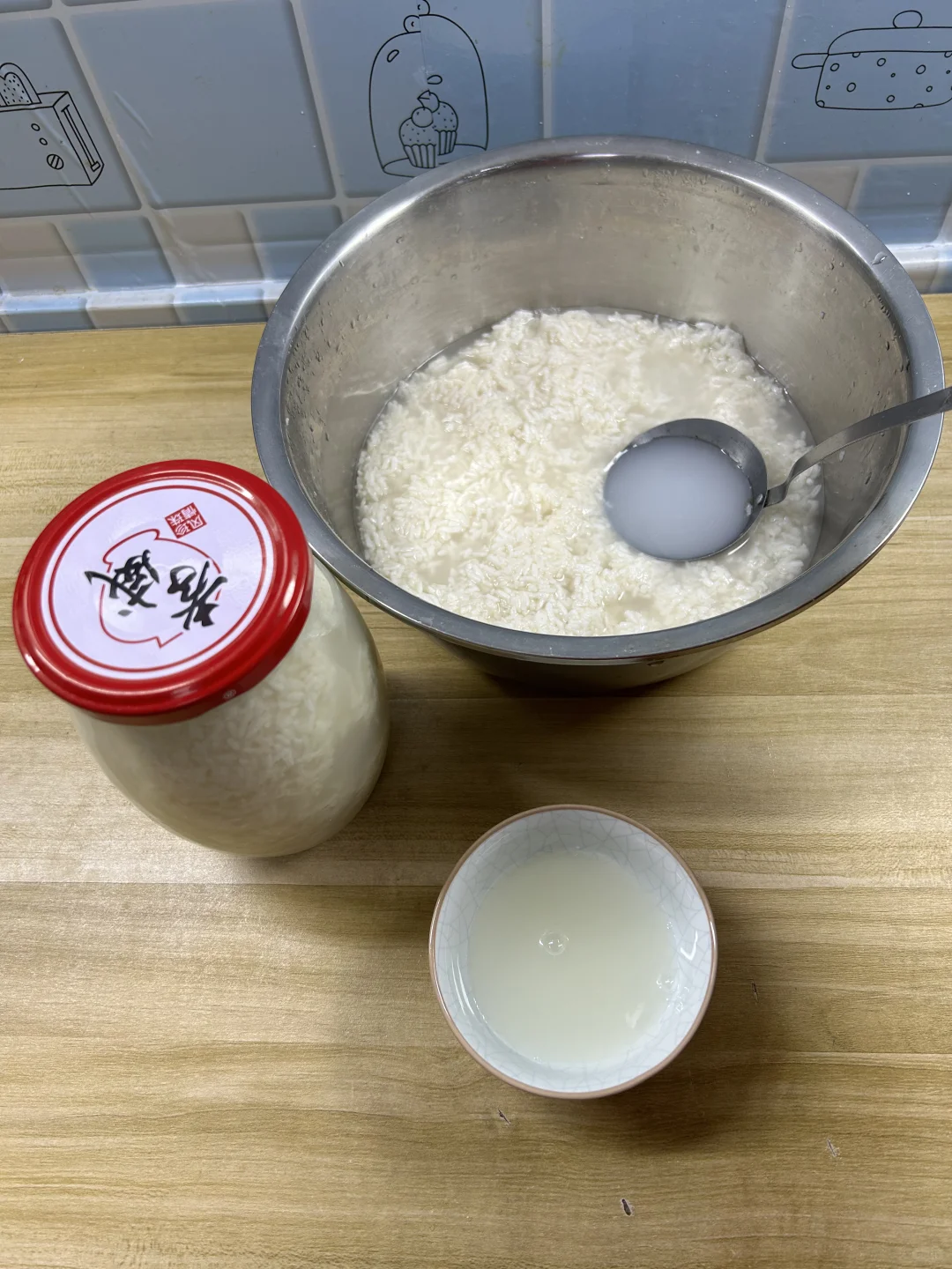 4. 按照甜酒曲说明书的比例,将甜酒曲均匀撒在糯米上,边撒边搅拌均匀。