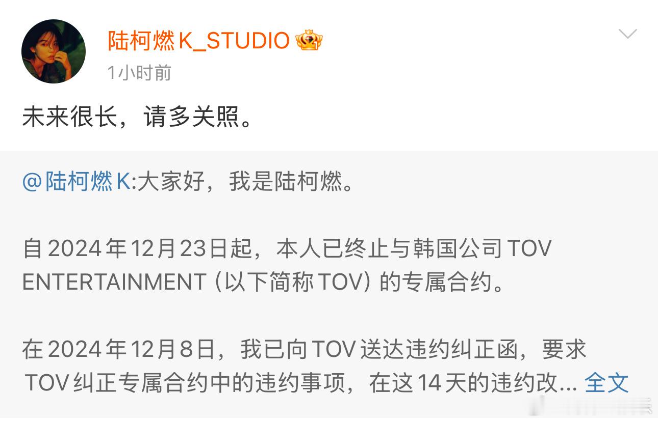 陆柯燃成立新工作室 陆柯燃解约了 今日,陆柯燃发文宣布与经纪公司解约,“自2024年12月23日起,本人已终止与韩国公司TOV ENTERTAINMENT(以下简称TOV)的专属合约。在2024年12月8日,我已向TOV送达违约纠正函,要求TOV纠正专属合约中的违约事项,在这14天的违约改正宽限期内,TOV没有改正任何违约行为,并拒绝沟通。所以于2024年12月23日本人已向TOV送达了解约函,通知TOV解除该专属合约。自本函送达之日起,TOV与本人的演艺经纪合作关系正式终止,TOV无权继续代理本人的演艺经纪事务,无权再依据专属合约享有任何权益。”同时,陆柯燃新工作室转发陆柯燃解约微博,开启营业状态,“未来很长,请多关照。”