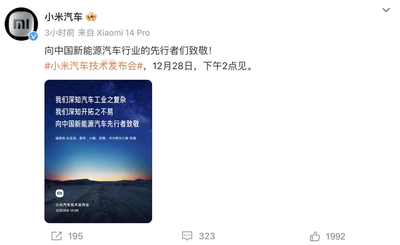 日本人没想到,美国人傻眼了,国产品牌不再窝里斗,这一回老外真的没办法了!小米汽车开启新篇章,致敬华为比亚迪,引领“人车家全生态”新潮流! 在新能源汽车行业风起云涌之际,小米汽车凭借着独特的格局和前瞻的视野,成为了这个时代的引领者。今天,小米汽车发布海报,向中国新能源汽车的先行者们致敬,并向“人车家全生态”的新理念迈出了坚实的一步。小米汽车深知汽车工业之复杂,也明白开拓之不易。他们不仅感激新能源汽车同行的支持,更是诚挚地向比亚迪、蔚来、小鹏、理想、华为等先行者致敬。这种谦虚和敬畏的态度,正是小米汽车能够站在巨人的肩膀上看世界的原因。 小米澎湃 OS 启动了新标识,以“星系迸发”为核心设计元素,表达了人与设备在澎湃宇宙中完成感应与连接的美好愿景。这个新标识正是小米“人车家全生态”理念的生动体现,标志着小米汽车的软硬件将更加协同,为用户带来更智能、更便捷的出行体验。实现硬件设备无缝连接、实时协同,小米将为用户创造一个以人为中心、主动服超级智能生态。在这个生态中,小米汽车的智能空间将不仅仅是移动终端,更是融入整个智能生活的关键节点。小米汽车致敬华为比亚迪