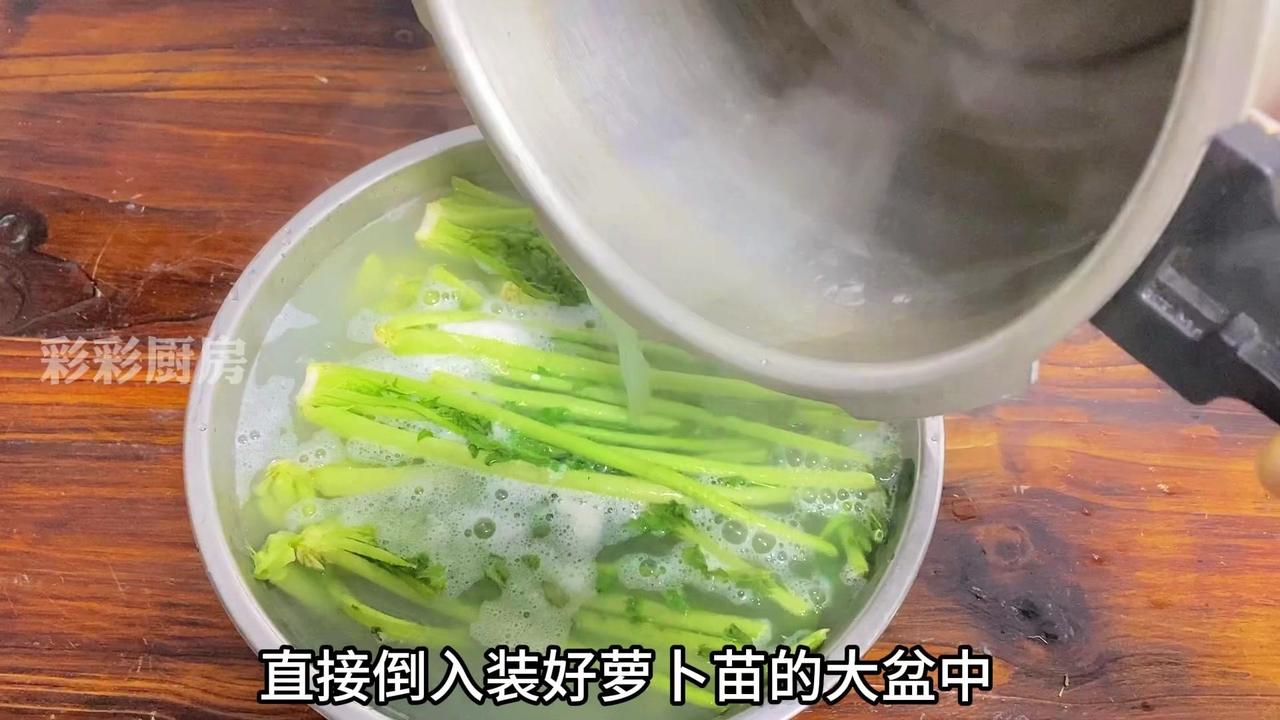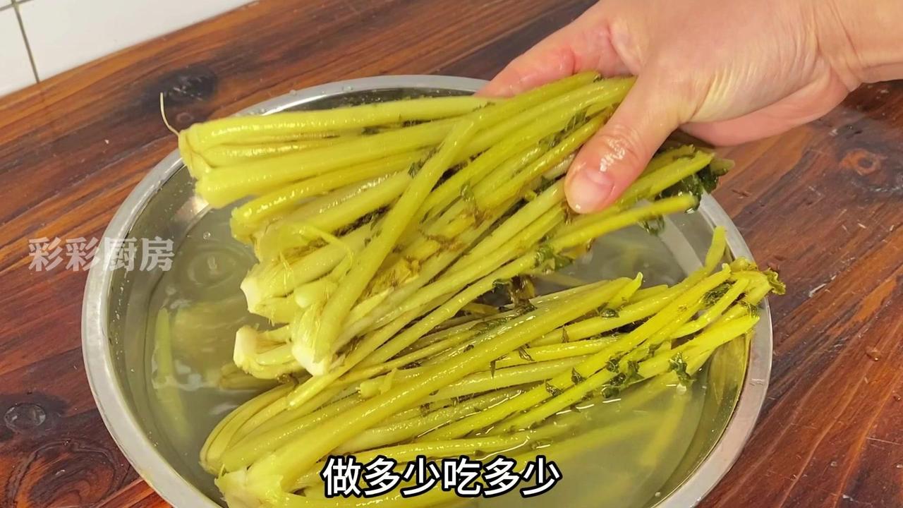 ✨想吃就做,做多少吃多少,方法非常简单,即便你从未做过酸菜,也能一次成功。 🍳食材: 萝卜干、淘米水、食用盐、姜、蒜、小米辣、豆豉、辣椒粉、酱油、白糖、味精、蚝油、青辣椒。 🍳做法: 1️⃣萝卜干削皮,摘掉多余叶子,中间用刀剖开,拿到太阳底下晾晒一天,多余水分晒出。 2️⃣晚上收回萝卜苗,淘米水倒入锅中,加入适量食用盐,用大火烧开。 3️⃣萝卜苗装到大盆中,用手压实,淘米水烧开后,倒入装好萝卜苗的大盆中,扣上一个盆子防止漂浮,趁热盖上两层保鲜膜,密封腌制3天。 4️⃣3天后,萝卜苗金黄,酸味微微酸,清洗干净切成小段。 5️⃣炒锅不用放油,直接倒入酸菜,煸干水分后盛出。 6️⃣锅中下入适量食用油,煸炒肥肠,加一点十三香、姜、蒜、小米辣、豆豉,爆香,适量辣椒粉和酱油,充分翻炒均匀,炒出香味。 7️⃣倒入酸菜继续翻炒,放一点青辣椒,少许白糖、盐、味精、蚝油调味,翻炒几下出锅装盆。 ✨用萝卜苗做酸菜,吃起来口感很脆,腌制时间较短,味道是微微酸。