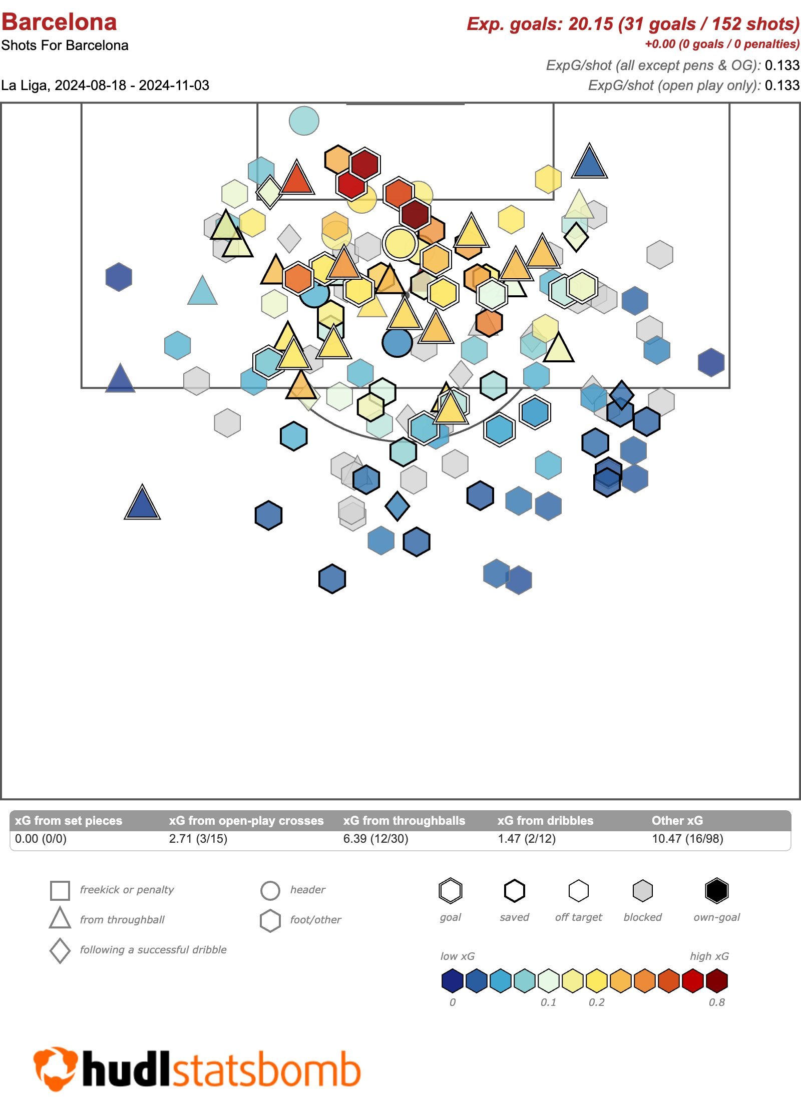 从赛季开始到主场同西班牙人的比赛,巴萨在20个预期进球中打进了31球,相当于+11