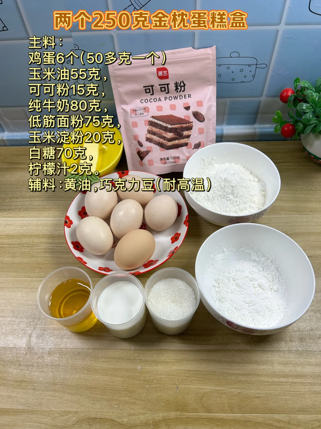 金枕蛋糕加上可可粉,就是香浓好吃的巧克力蛋糕。 主料:鸡蛋6个(50多克一个),玉米油55克,可可粉15克,纯牛奶80克,低筋面粉75克,玉米淀粉20克,白糖70克,柠檬汁2克。 辅料:黄油,巧克力豆(耐高温) 步骤: 1.蛋黄糊:玉米油加热到60度,加可可粉,拌匀,加纯牛奶,拌匀,筛入低筋面粉和玉米淀粉,拌匀,加蛋黄,拌匀。 2.蛋白霜:蛋清冷冻15分钟,加柠檬汁、白糖,打发到直立尖角。 3.蛋黄糊和蛋白霜混合。 4.倒入两个250克纸盒金枕蛋糕模具。中间挤一条软化的黄油,撒巧克力豆。 5.烤箱预热,上下火145度烤一小时。(40升烤箱)
