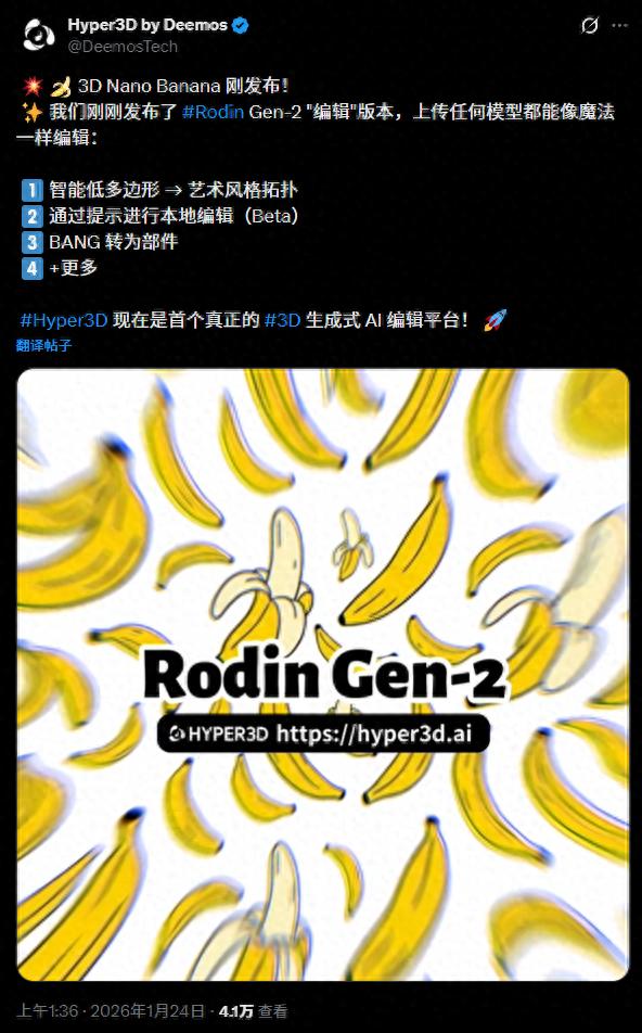 图片领域有Nano Banana、视频领域有可灵o1,现在3D领域,hyper3D带着他们的Rodin Gen-2也来了。