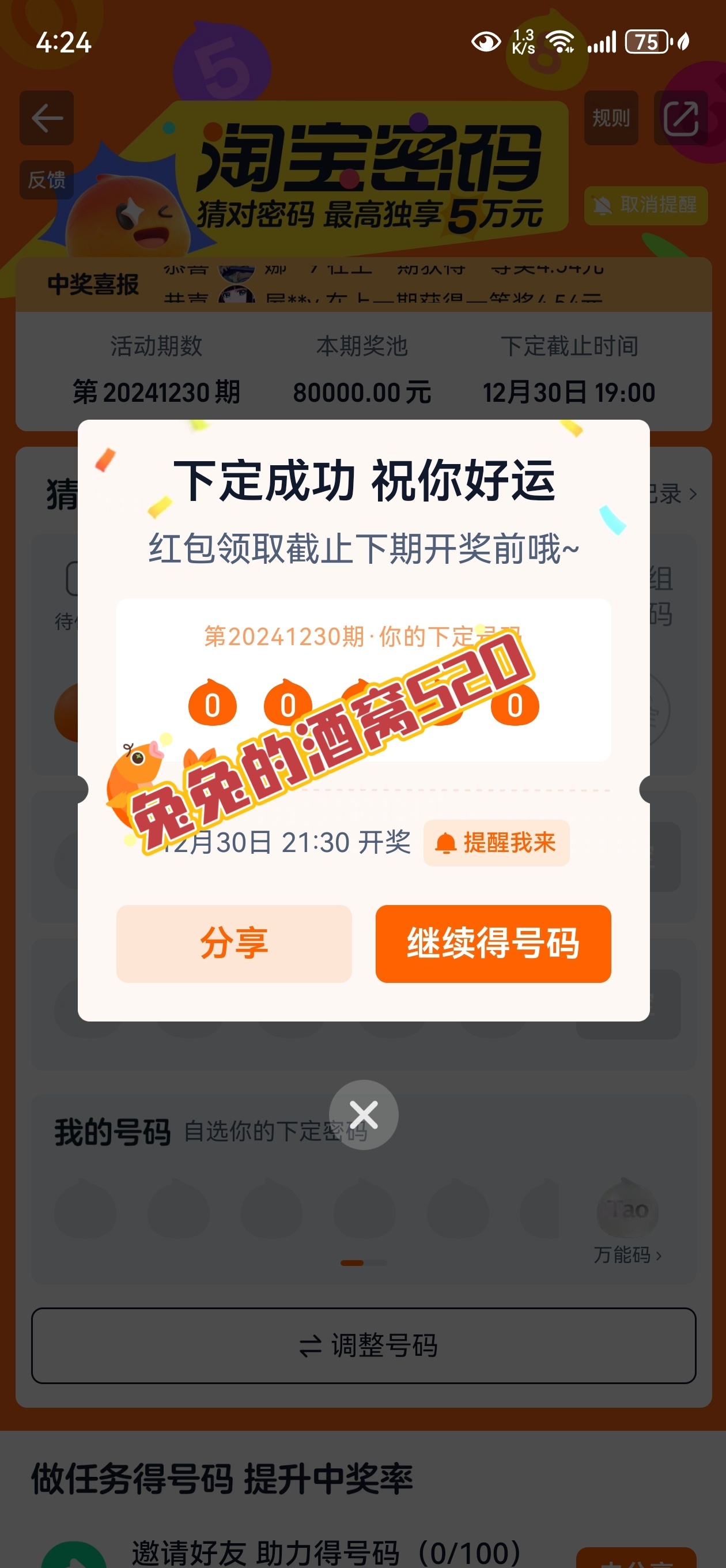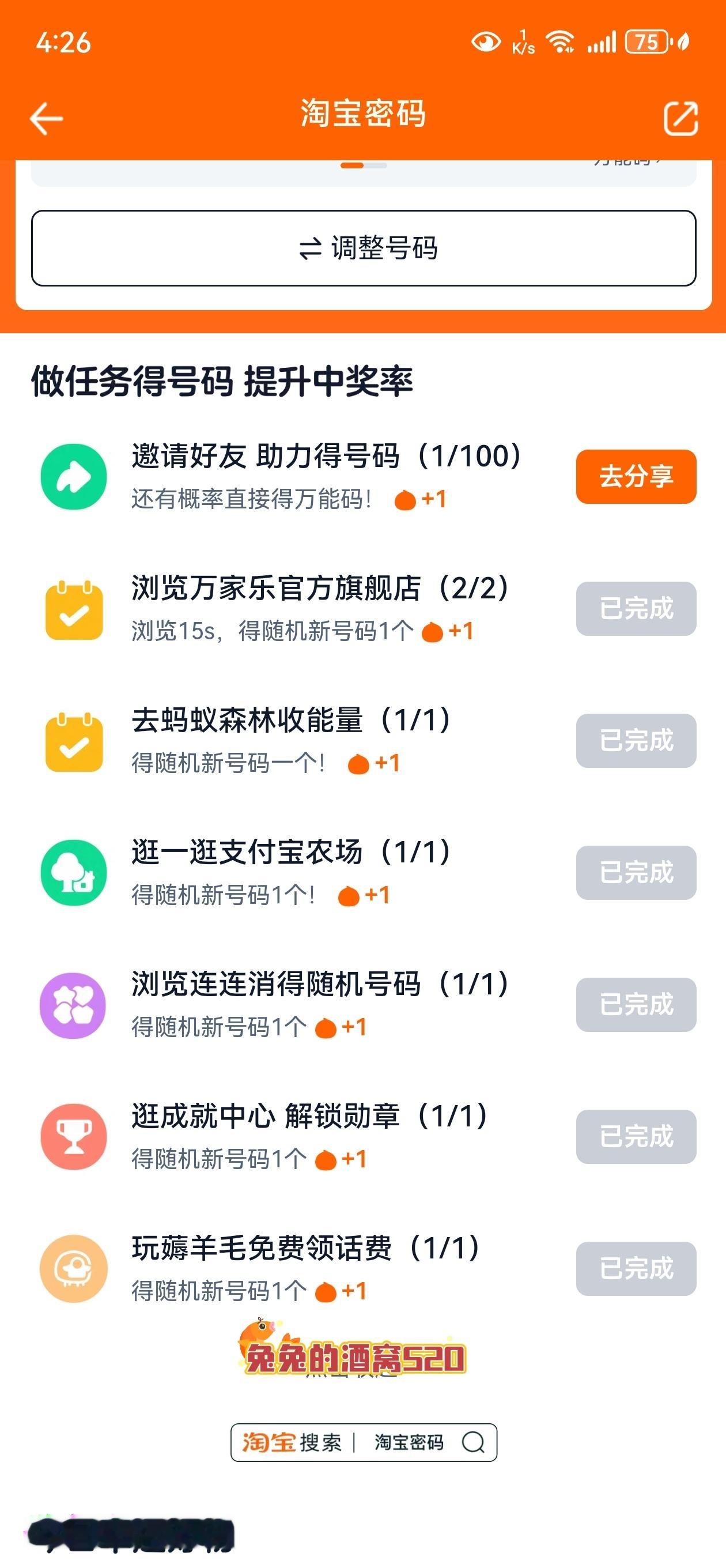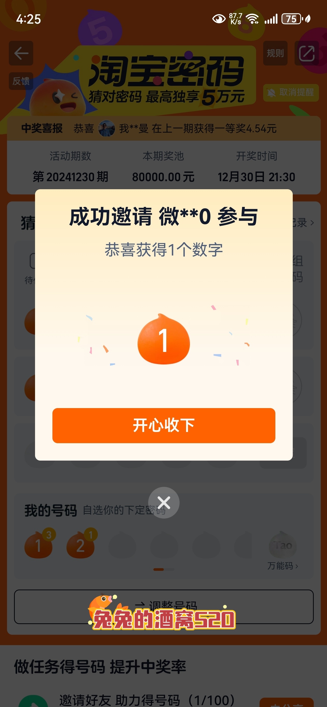 🌸🌸兔兔我现在已经有了2组淘宝密码啦(图4),就等着开奖那天好运降临[太阳]。小伙伴们,这么有趣又有福利的活动,可不要错过呀[哈哈],说不定下一个大奖红包就是你哦[并不简单]!赶紧行动起来,一起加入这场幸运的“淘宝密码”之旅吧,让我们一起期待好运的降临,收获满满的惊喜和快乐![努力][努力]