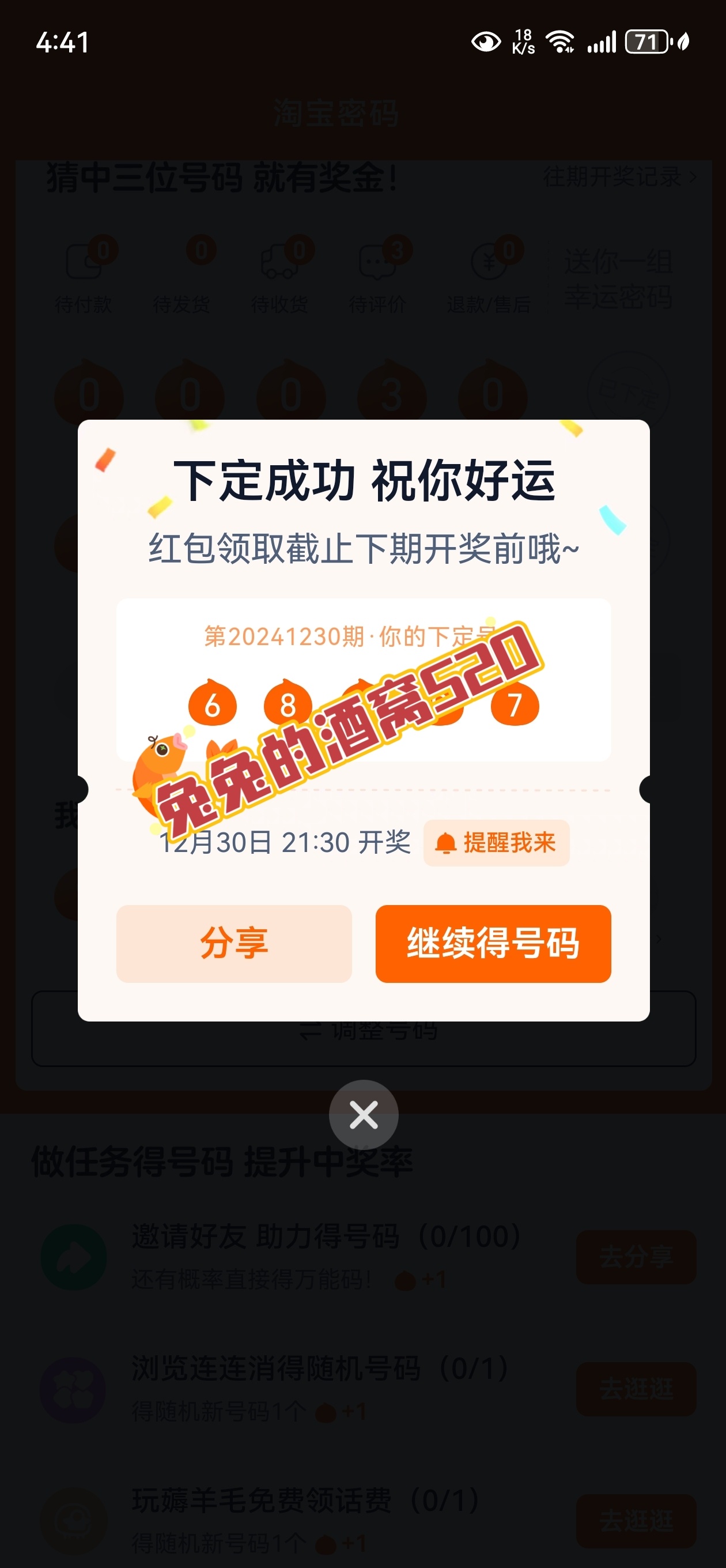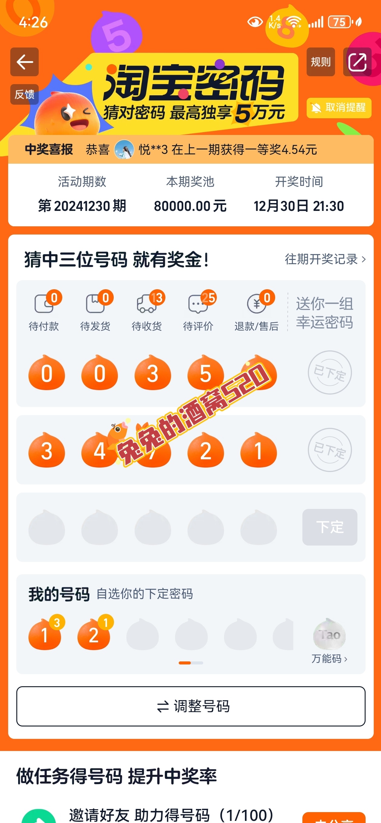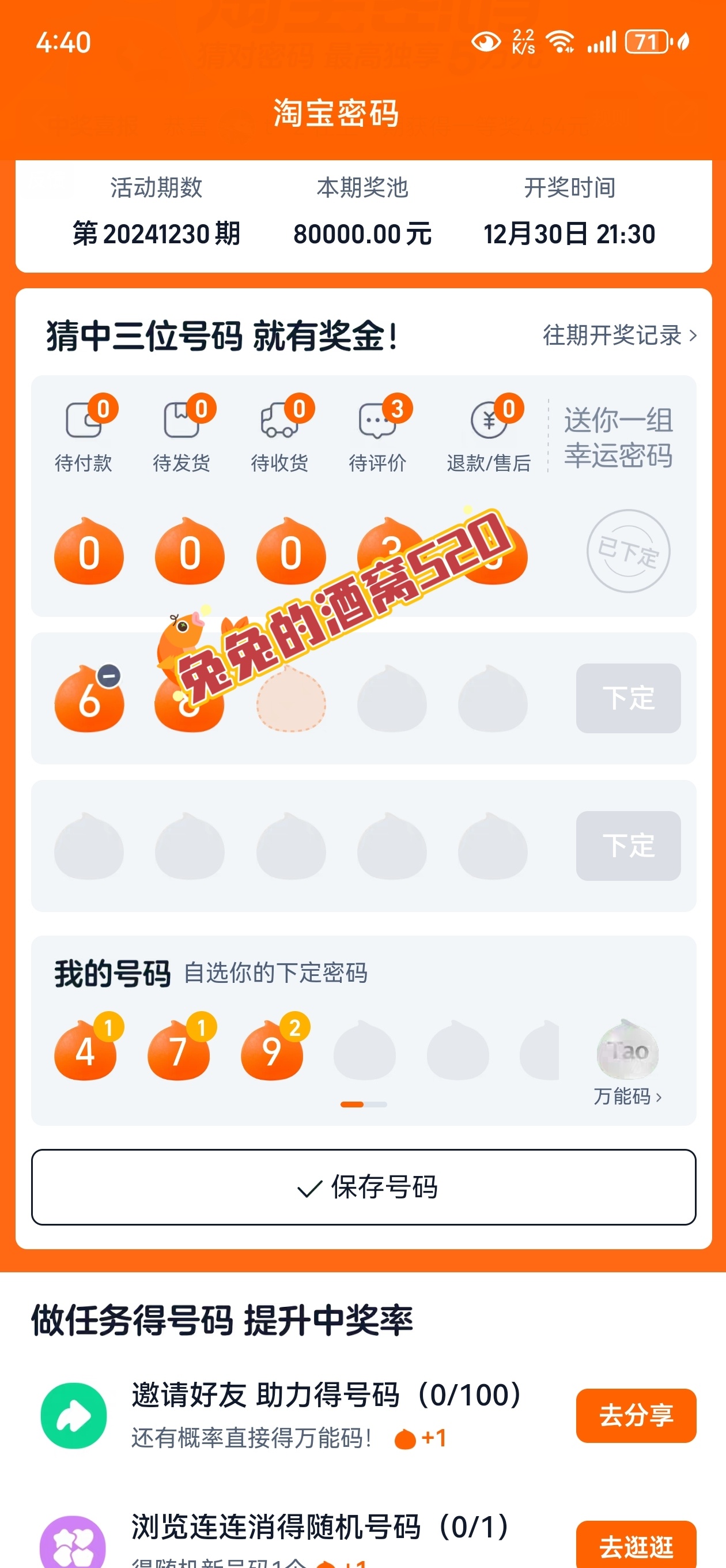 进入页面后,就到了获取号码的环节咯[收到]。首先,在每个开奖周期首次访问活动页面时,平台会根据我们淘宝订单的不同状态,像是待付款、待发货、待收货、待评价、售后退款这5个订单状态对应的数量,给我们生成一组初始幸运密码📝,看这就是我生成的!(图4)这是活动给我们的一个小惊喜开场[老师爱你]。然后,我们再完成一些简单的任务,比如浏览商品之类的(图3),就能获得更多的下定号码,这样中奖概率也会大大提升![高分喷雾][高分喷雾]