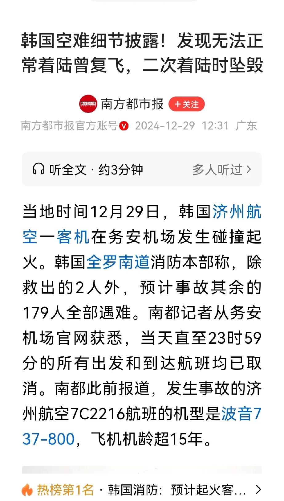 据韩国消防消息:除2人获救外预计事故其余人员全部遇难!韩国起火客机推测179人遇难看到这个新闻,觉得太惨了! 生还的两名人员是机上乘务人员。 据报道是一架波音737—800,飞机的机龄已经15年,所幸机上无中国人。致179人遇难