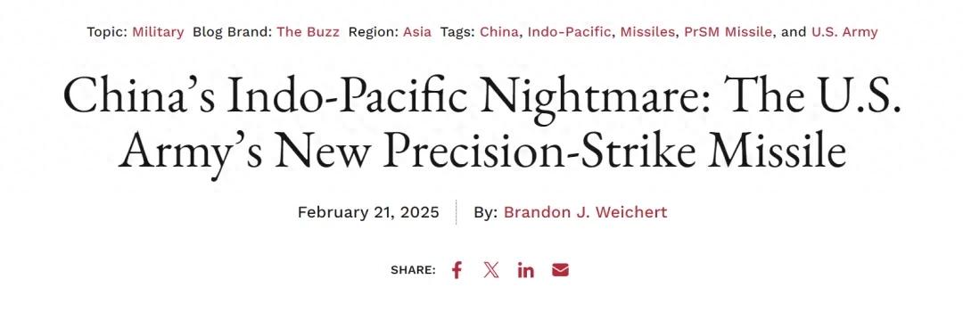 美媒指出,中国拥有了以远程打击导弹为核心的反介入/区域拒止能力,美国海军以及空军都难以突破这层严密的防护网络,最好的解决办法是让美国陆军拥有远程打击能力,可以在第一岛链向中国境内投掷弹药,削弱中国的反介入/区域拒止能力,而PrSM导弹正是美陆军理想的武器系统。
