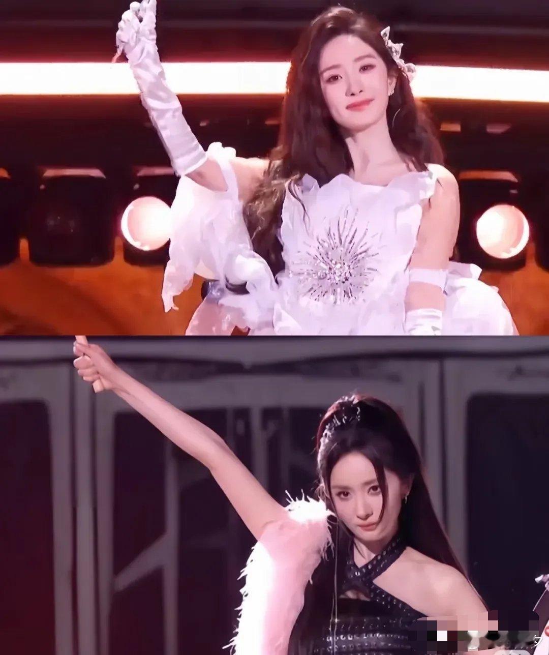 杨幂在跨年演唱会上与大张伟icon合作表演,穿着时尚,展现出良好的精神状态。