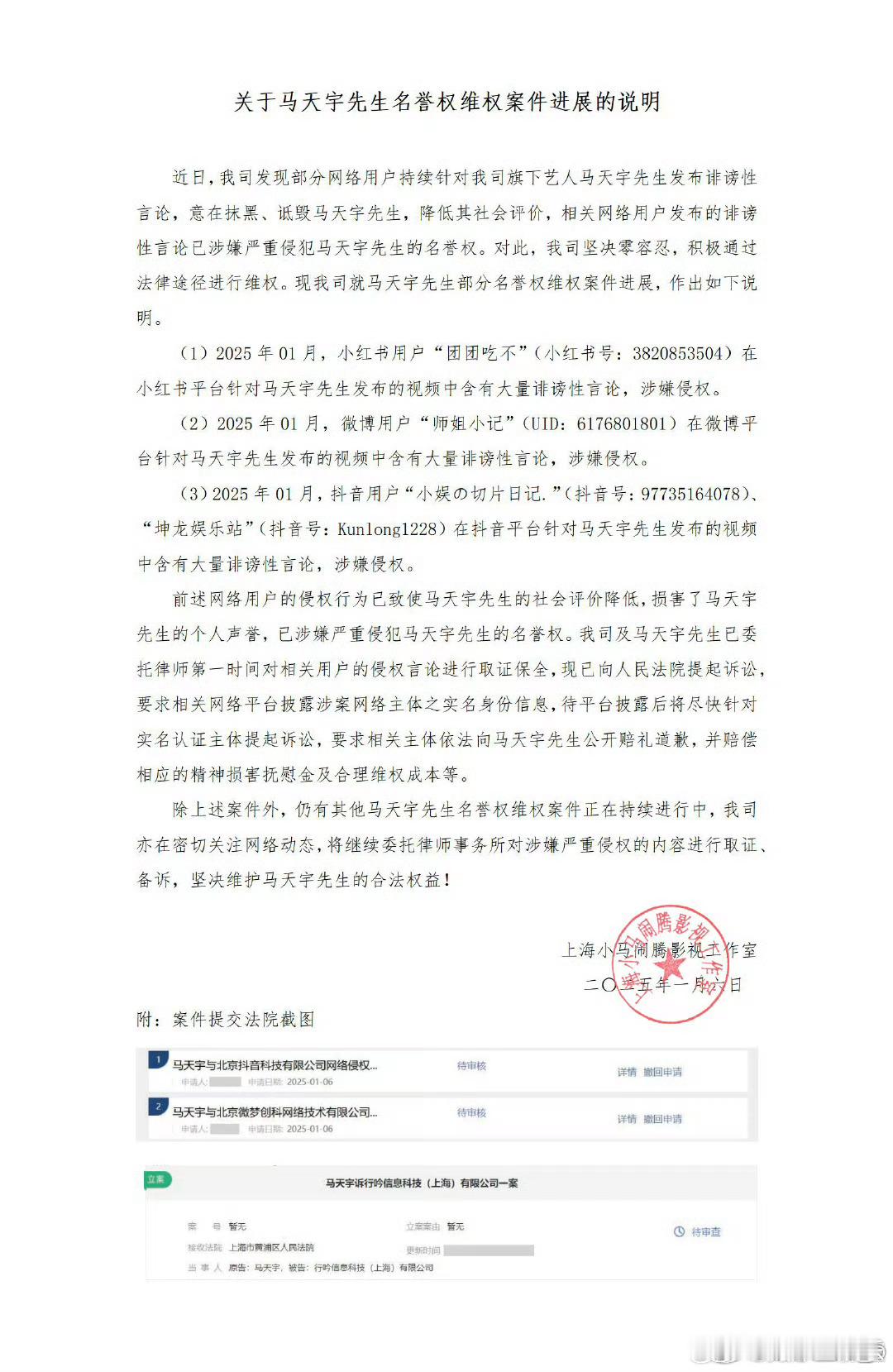 马天宇名誉权维权进展 6日,发布《关于马天宇先生名誉权维权案件进展的说明》:“近日,我司发现部分网络用户持续针对我司旗下艺人马天宇先生发布诽谤性言论,意在抹黑、诋毁马天宇先生,降低其社会评价,相关网络用户发布的诽谤性言论已涉嫌严重侵犯马天宇先生的名誉权。对此,我司坚决零容忍,积极通过法律途径进行维权。我司亦在密切关注网络动态,将继续委托律师事务所对涉嫌严重侵权的内容进行取证备诉,坚决维护马天宇先生的合法权益!”