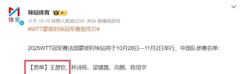 意外的是,印度亚锦赛才刚开始,咪咕体育又发布了将于10月28日开始的WTT蒙彼利埃冠军赛的参赛名单。