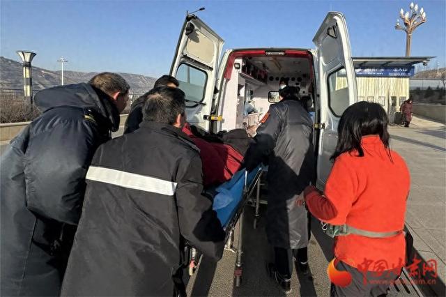 9时28分,旅客张先生被顺利送上120救护车,前往环县第一人民医院进行救治。