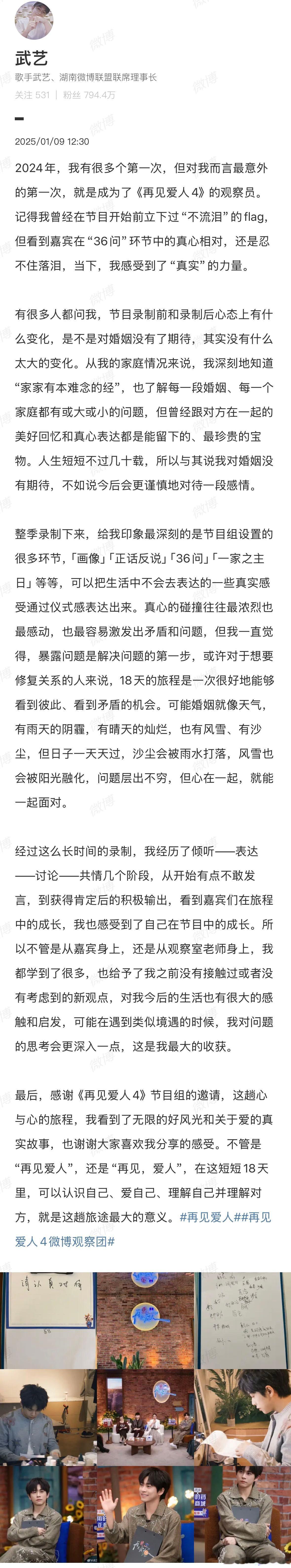 武艺告别再见爱人 被告别再见爱人的长文感动到,把婚姻形容成天气,虽然有风有雨,但总能被冲刷融化,真的是真诚又用心的文字