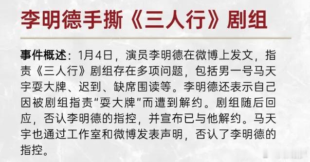 2. 剧组和马天宇回应: 剧组站出来回应,并表示李明德是倒打一耙。紧接着马天宇站出来回应,对李明德阴阳怪气了一番。