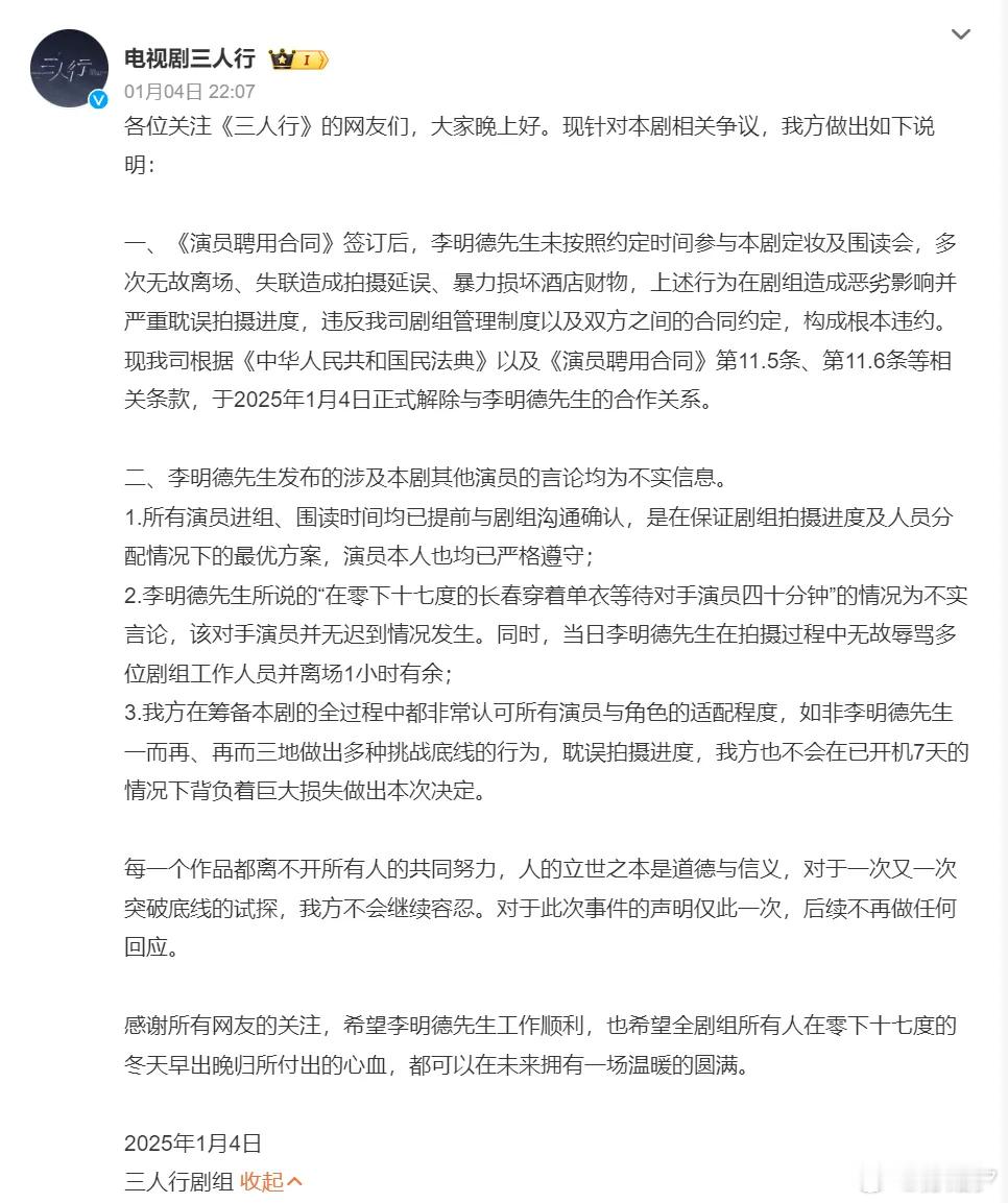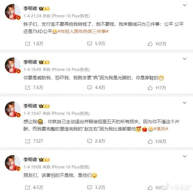 4. 李明德宣布退圈: 李明德在社交平台上宣布退圈,他表示这是自己最后一次提到关于剧组的事情,接下来要开始北漂了。