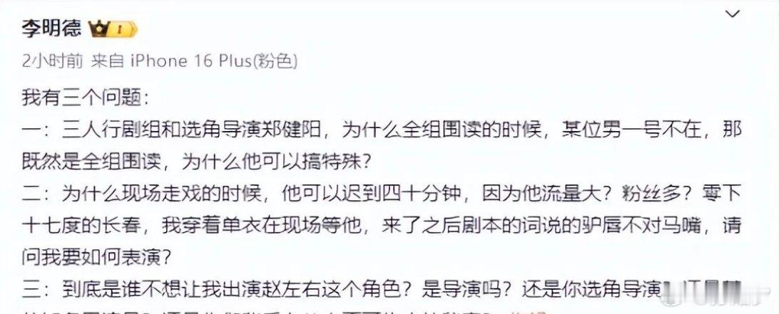 2025年娱乐圈第一个周末,18线演员李明德因与马天宇、《三人行》剧组的纠纷以及捐款争议成为热议焦点。虽然他一度获得网友的同情和支持,但随着更多争议的曝光,他的形象和口碑已经发生了巨大变化。