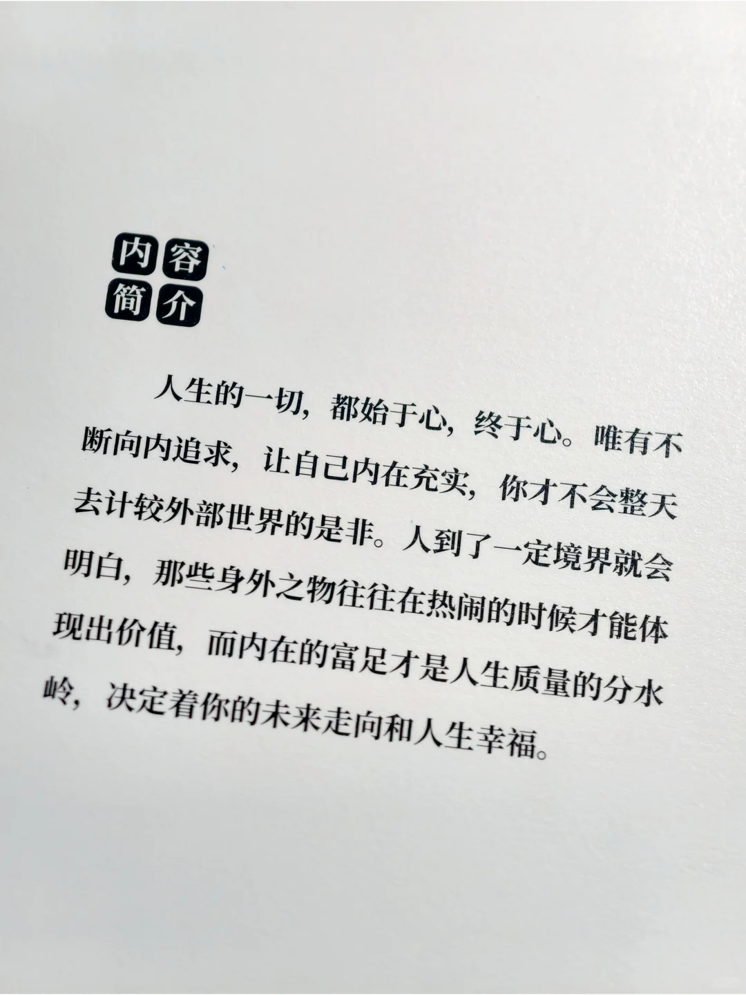 “人生的一切,都始于心,终于心。唯有不断向内追求,让自己内在充实,你才不会整天去计较外部世界的是非。人到了一定境界就会明白,那些身外之物往往在热闹的时候才能体现出价值,而内在的富足才是人生质量的分水岭,决定着你的未来走向和人生幸福。”