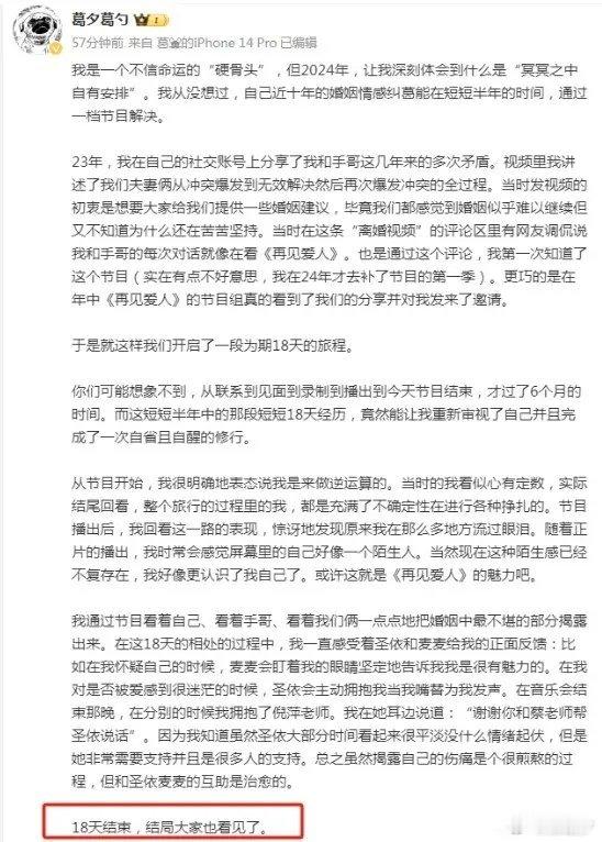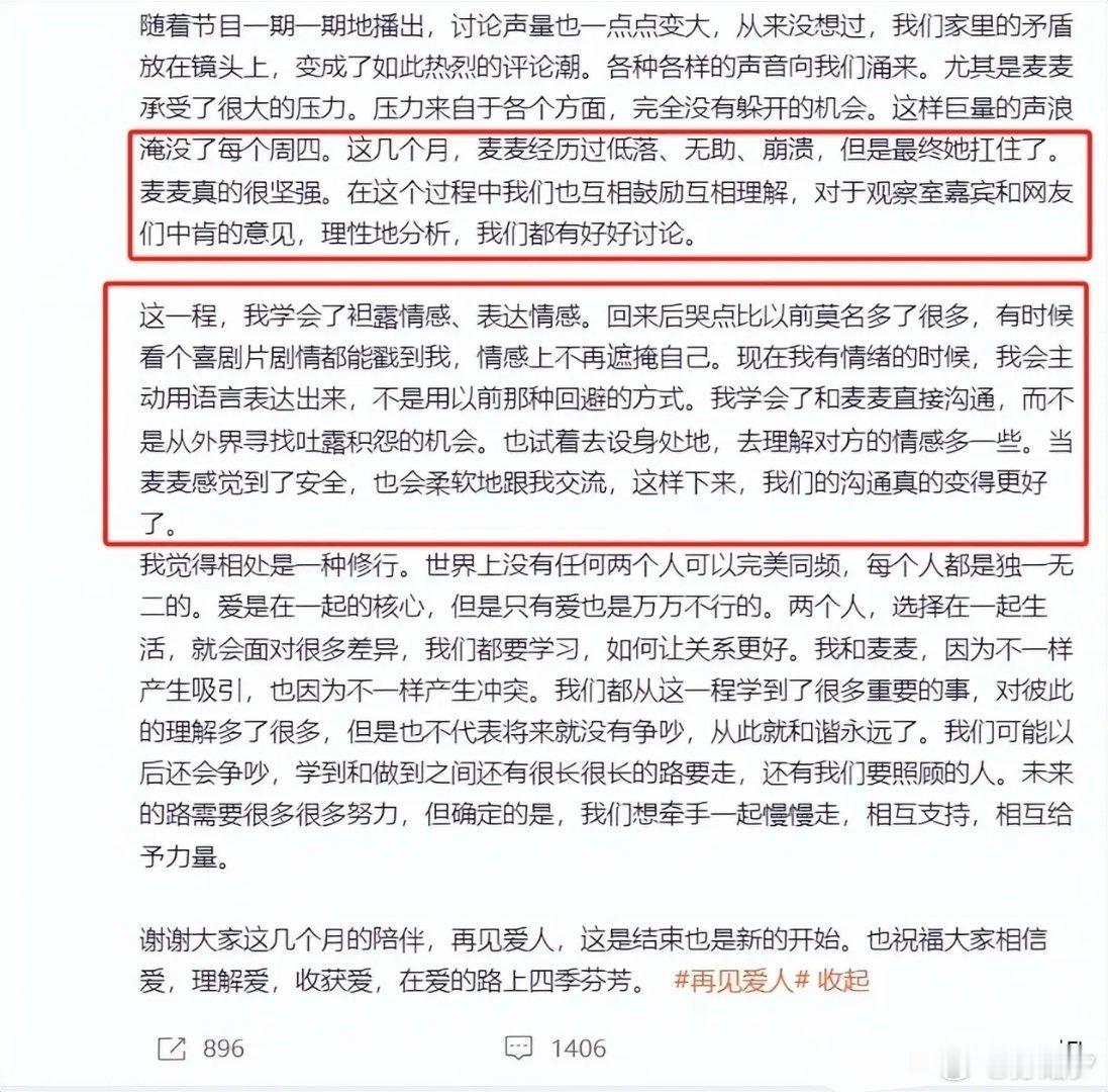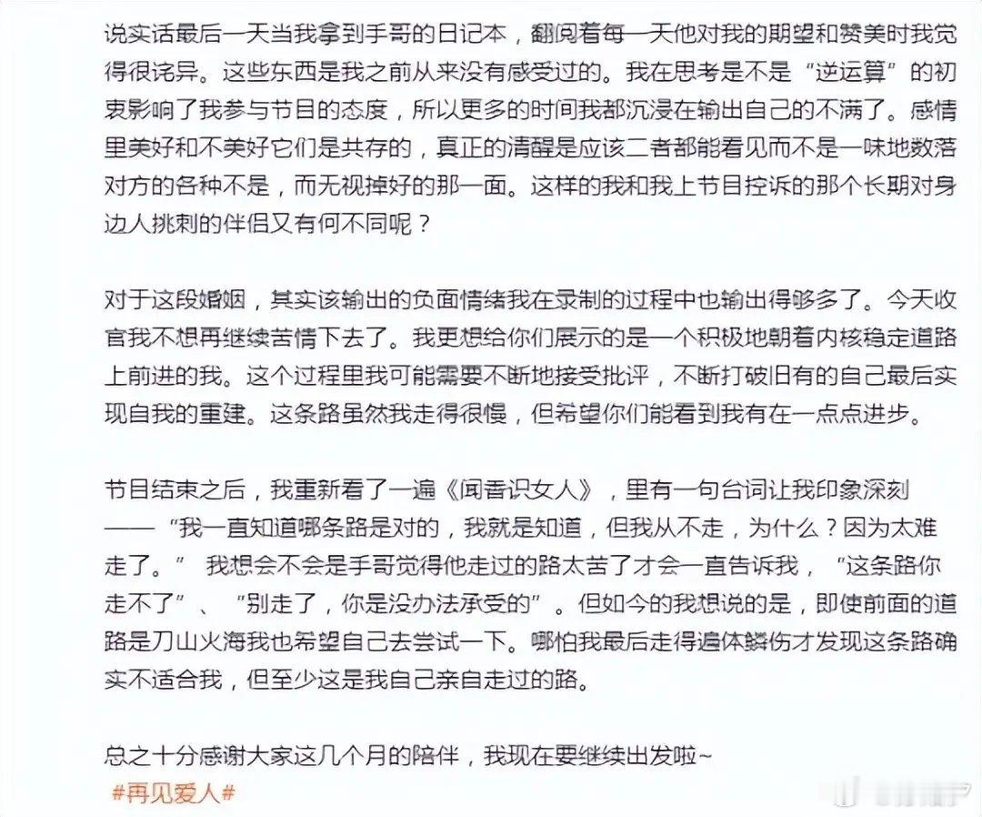在《再见爱人》第四季收官后,包括黄圣依、麦琳、李行亮 葛夕等6人先后发长文告别。其中杨子、留几手正式官宣离婚,麦琳没有抱怨被网暴而是学会了反省,葛夕更是一如既往的展现坚强、乐观的一面,黄圣依全文不提杨子,做法相当硬气。