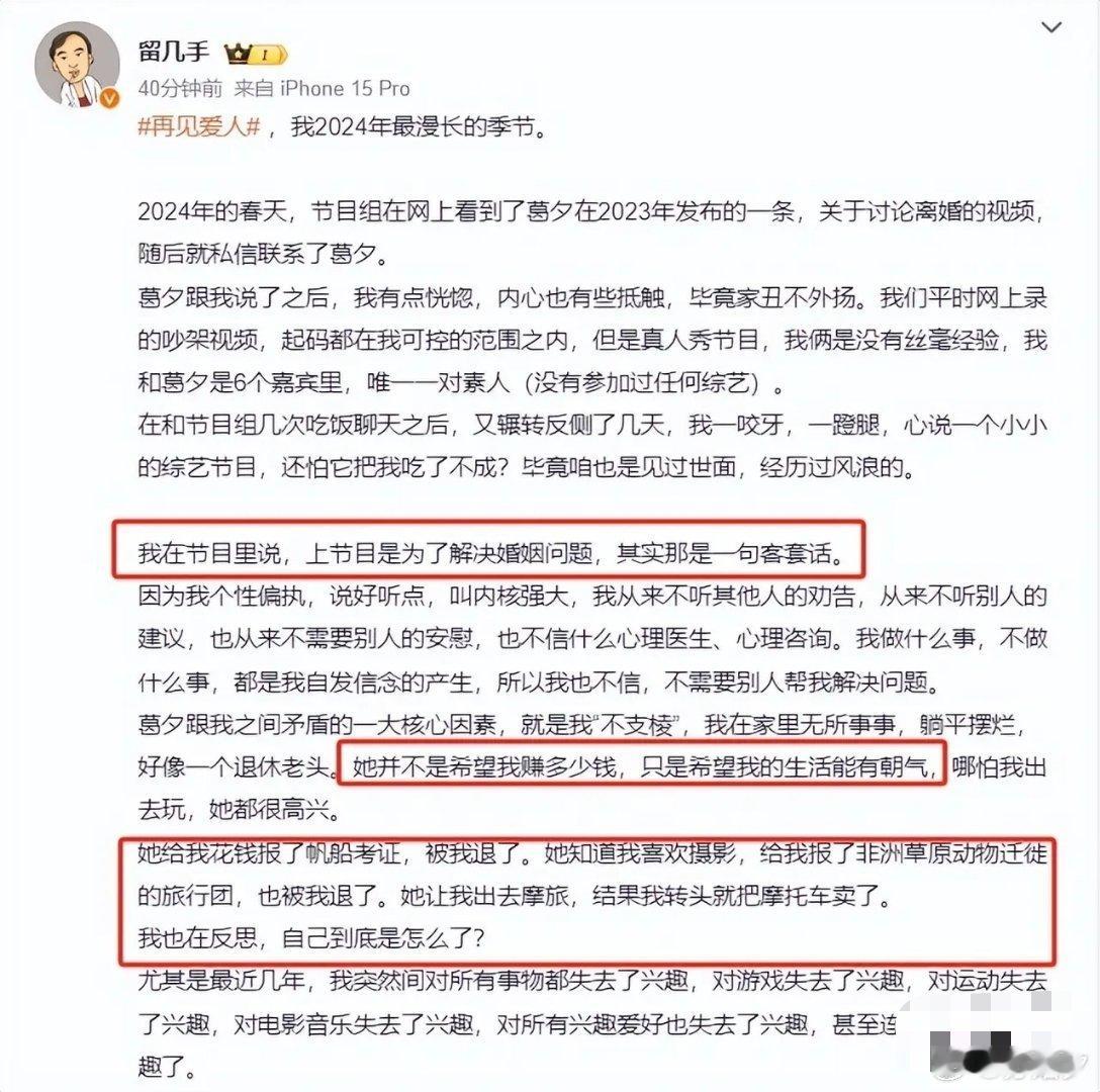留几手不上进、不把葛夕母亲当回事,在葛夕生病时不闻不问,共同投资却仅赔光了葛夕的钱。葛夕选择离开留几手,她发文表示要重新出发,展现了独立女性的形象。
