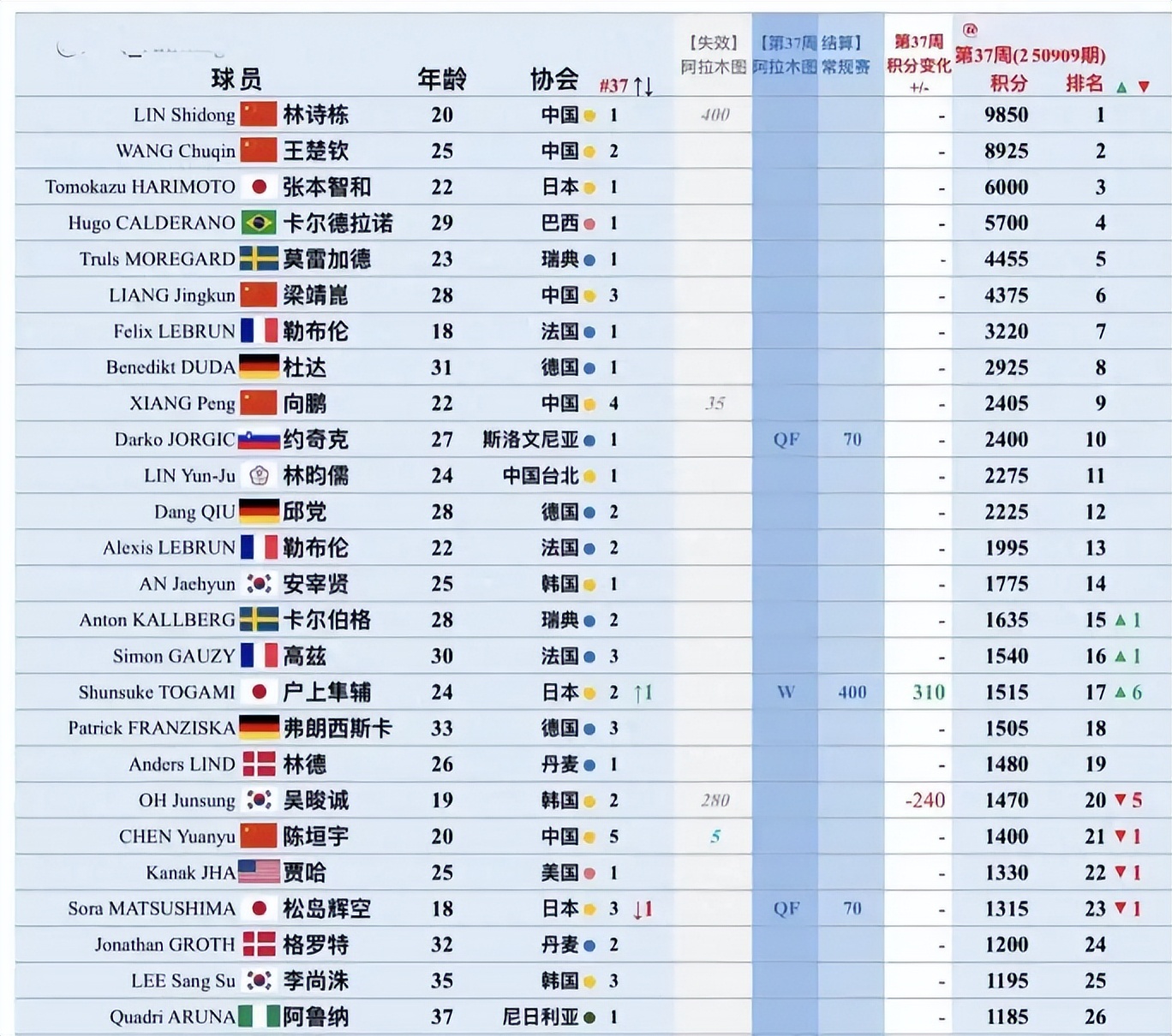 9月8日在阿拉木图挑战赛落幕之际,WTT男单最新排名于第37周更新,中国小将林诗栋以9850分继续领跑世界第一,但竞争格局暗流涌动。日本选手户上隼辅凭借本站冠军战绩,积分飙升至1515分,排名跃居第17位,而中国选手周启豪虽获亚军却意外止步,世界排名升至第34位,引发球迷热议。