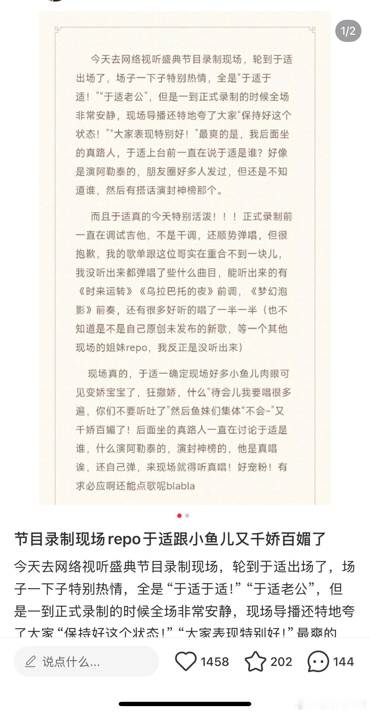 于适网络视听盛典路透 近日在2025网络视听盛典现场,于适被粉丝捕捉到身影。他身着米色外套,在现场调试吉他后弹唱了不少歌曲,像《乌拉巴托的夜》的旋律响起时,粉丝都沸腾了。他真的太宠粉,对他好感度直线上升。1月24日晚8点,锁定节目看他的舞台。